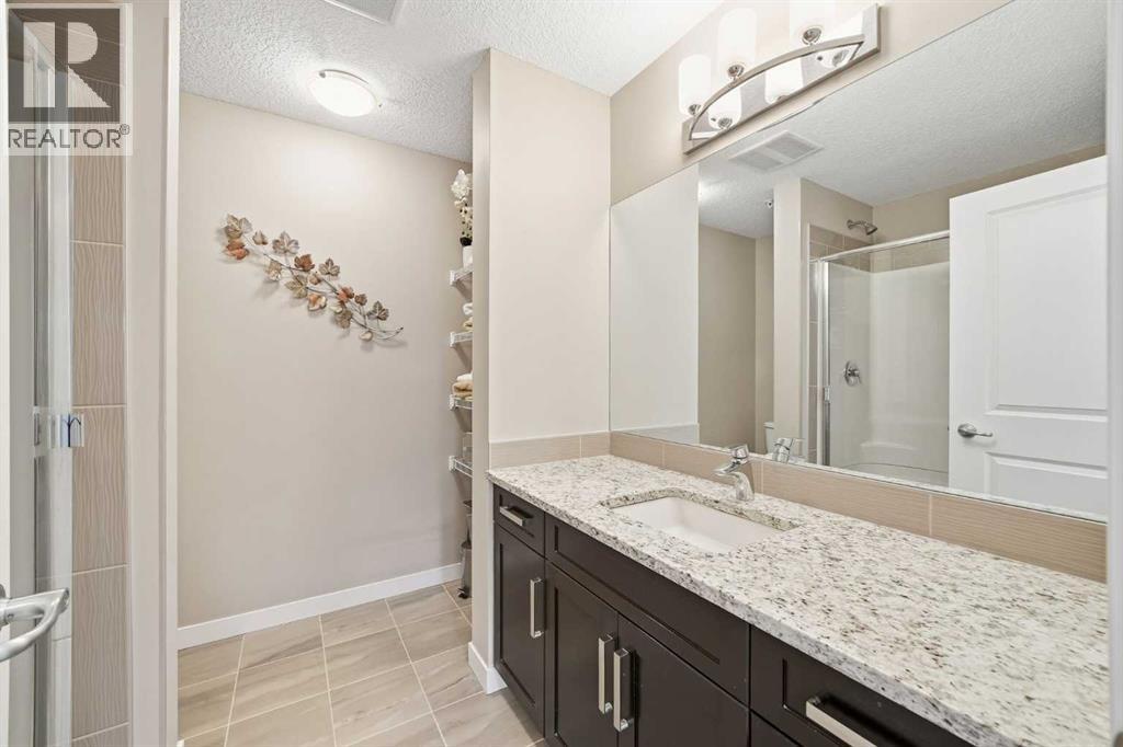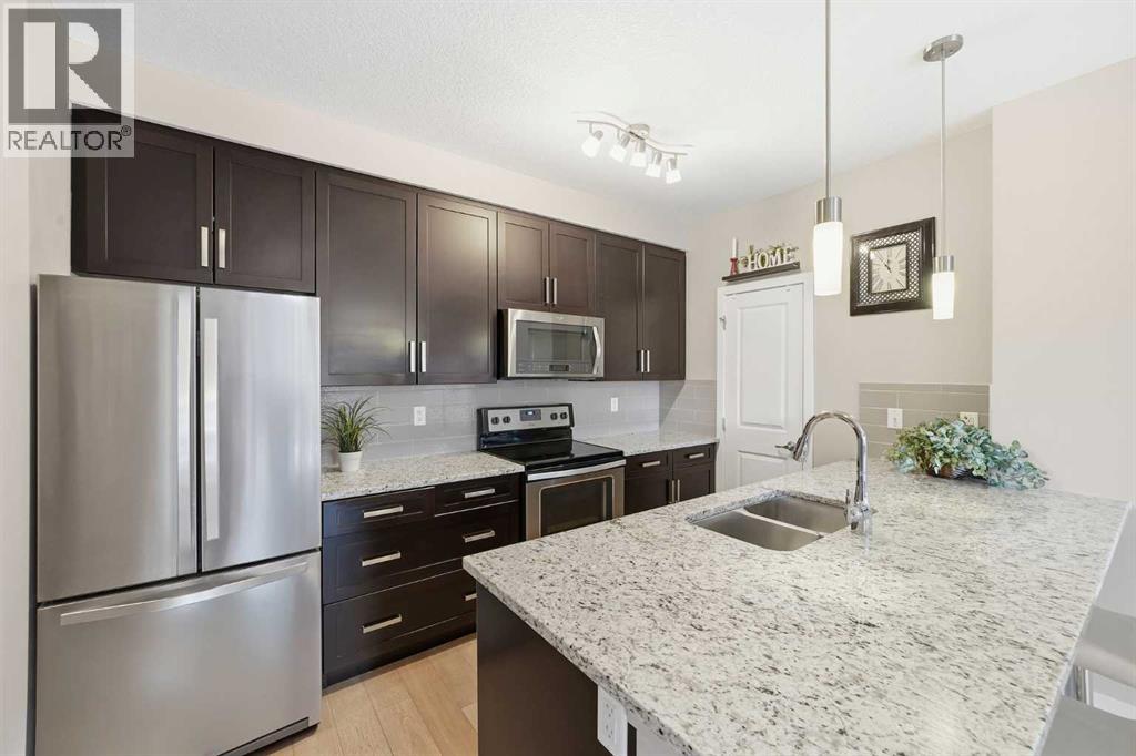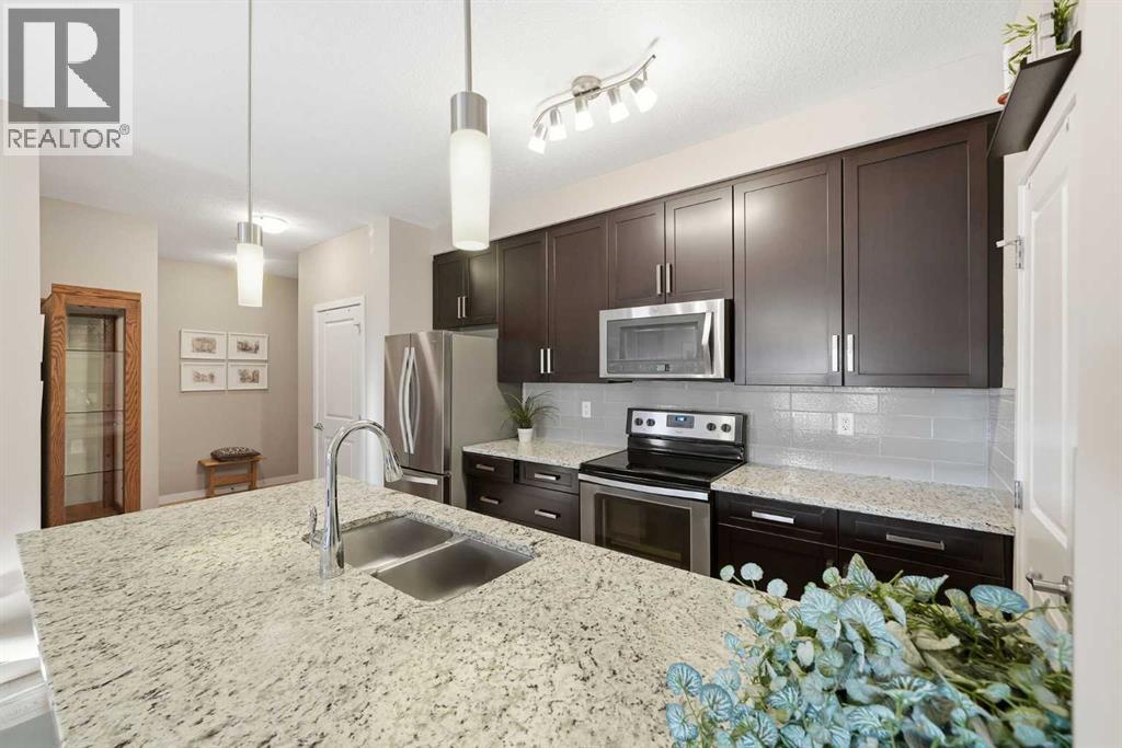 Hello #107!!Discover this bright and beautifully maintained 2-bedroom, 2-bathroom main-floor condo offering over 924 sq. ft. of thoughtfully designed living space in one of Calgary’s most sought-after southeast communities. With true pride of ownership throughout, this home seamlessly blends modern style, comfort, and everyday convenience.The open-concept layout features 9-foot ceilings and large south-facing windows that flood the space with natural light. The modern kitchen is well-appointed with sleek quartz countertops, lightly used stainless steel appliances, abundant cabinetry, a large walk-in pantry, and a generous breakfast bar that comfortably seats four—perfect for casual dining or entertaining. The kitchen flows effortlessly into the dining and living areas, finished with luxury vinyl plank flooring, creating a warm and inviting atmosphere.Step outside to your private patio, an ideal spot for a morning coffee. You’ll enjoy the privacy of this corner unit and the open green space! The spacious primary suite offers a walk-through closet and a 4-piece ensuite, while the second bedroom provides the same sun-drenched ambiance; excellent for guests, a home office, or a roommate, and conveniently located next to a second full bathroom.Additional features include in-suite full-size stackable laundry, a dedicated storage locker, an assigned parking stall conveniently located at the front entry, ample visitor parking, and access to a common courtyard playground. The quiet, family-friendly building enhances the appeal of this comfortable and functional home. Residents of Cranston enjoy Cranston Century Hall with a gym, splash park, skating rink, sports courts, and event spaces. Trail and park adventurers will love the walking and biking paths connecting to Fish Creek Park and the Bow River. Residents benefit from nearby schools, playgrounds, green spaces, shopping, dining, and entertainment that are minutes away at Cranston Market and Seton Urban District, as well as South Health Campus, Cineplex, and the world’s largest YMCA. With quick access to Deerfoot Trail, Stoney Trail, and public transit, commuting is easy and convenient.Whether you’re a first-time buyer, investor, or downsizer, this beauty offers the perfect blend of comfort and convenience. (id:51913)