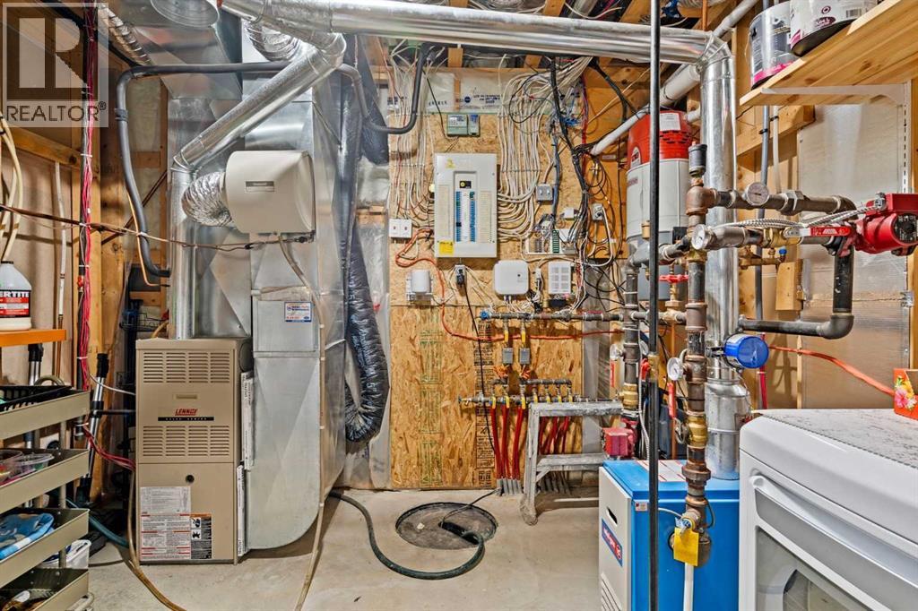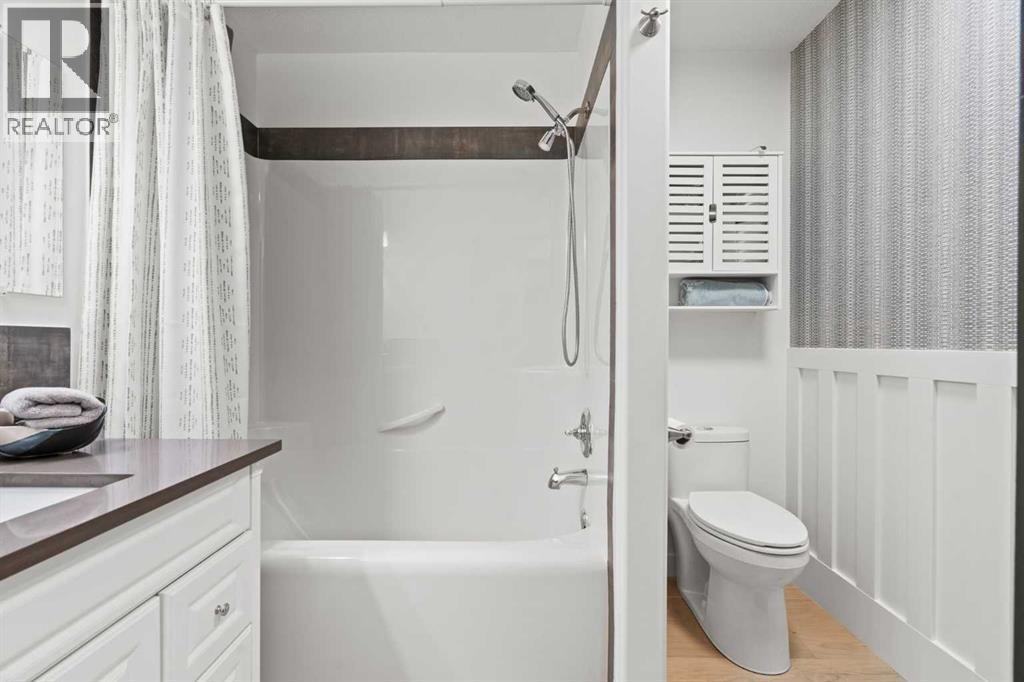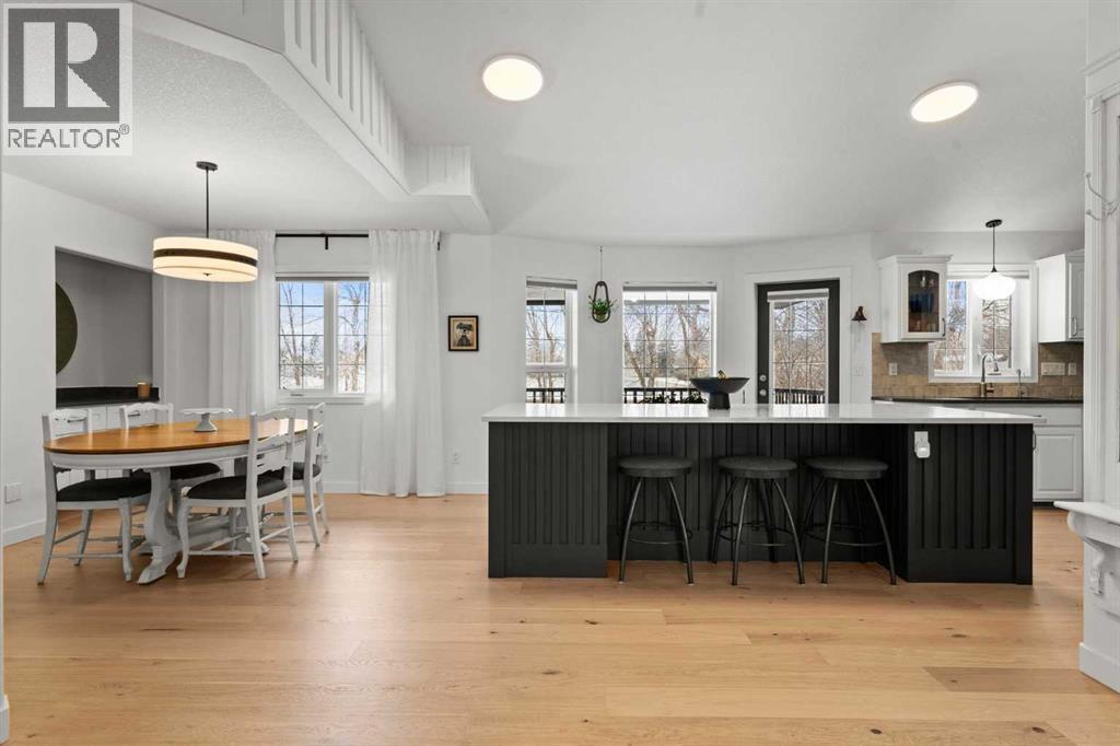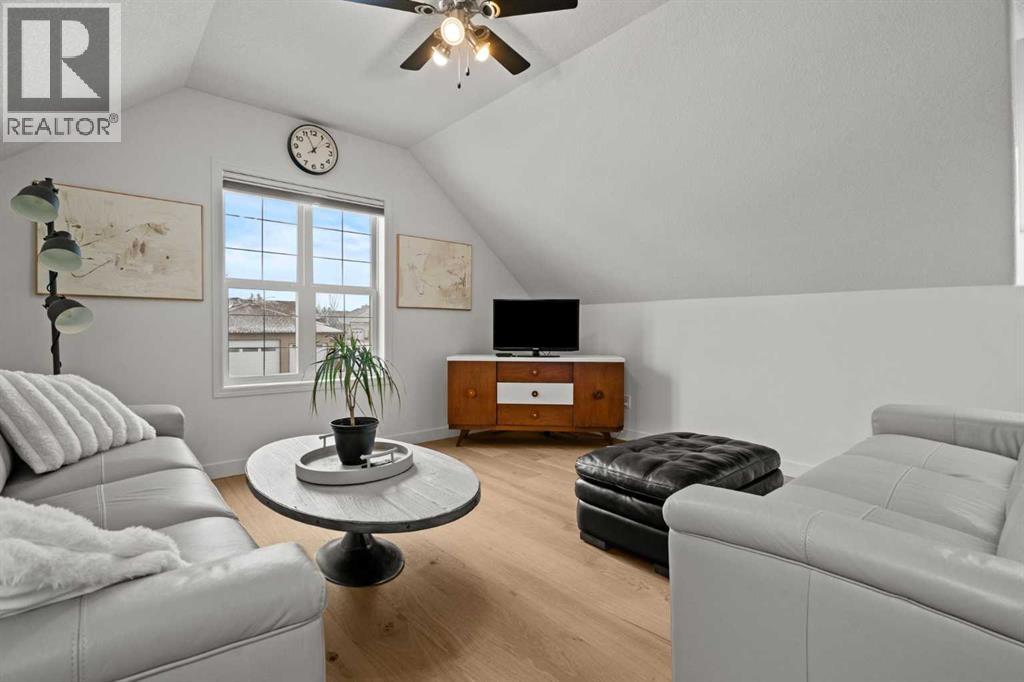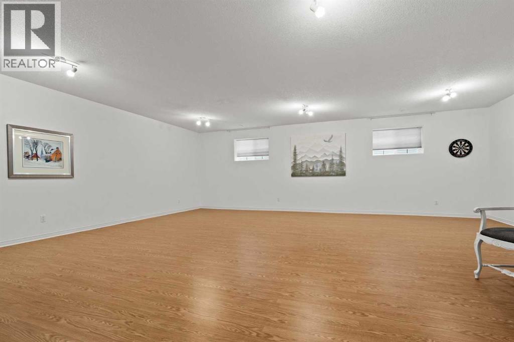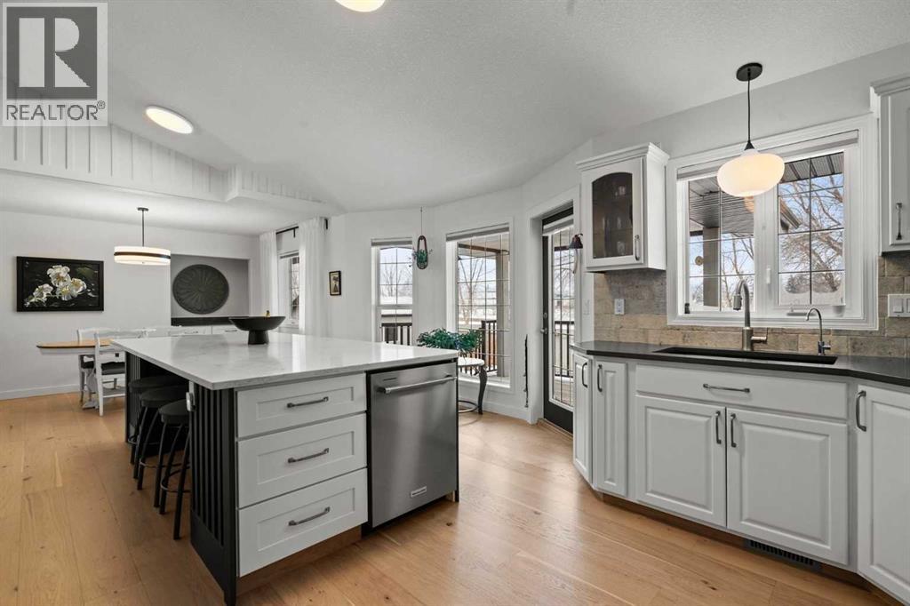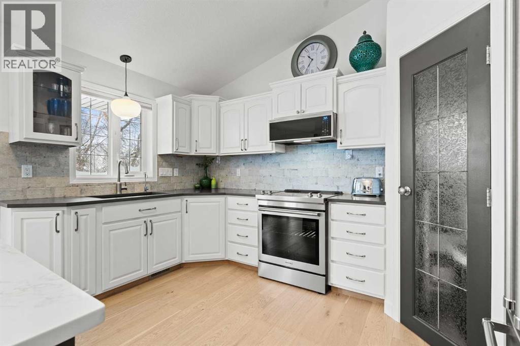 This MOVE IN READY HOME has been thoughtfully updated with features that focus on function in designing this ELEGANT MAKEOVER. A freshly painted front exterior and cozy covered front verandah speak to the classic curb appeal that sets this home apart in a league of it's own. Vaulted ceilings soaring above banks of windows that capture the natural light highlight the open floor plan that flows seamlessly... inviting larger family gatherings or intimate get togethers. A neutral paint palette offsets the gorgeous new engineered hardwood flooring - trimmed with high profile baseboards on the main floor. Masterfully crafted is the focal point of the main floor - a stunning island addition that isn't just an amazing storage and dining area.. it's the hub of this gorgeous family home. Custom designed wood details trim the island and complement the feature walls located in several areas of the house. A massive quartz slab accentuates the grandness of the island and showcases the sleek quartz topped cabinetry at the rear of the kitchen. A refreshed stone tiled backsplash complements the Stainless Steel appliances. Banks of drawers have been added for convenient storage. A spacious Living Room with a re-faced gas fireplace is offset from the kitchen for entertaining. An open-ended dining area boasts enough room for a larger table and a servery/coffee bar has been added for your convenience. The primary suite tucked away at the end of the hall delivers privacy and solitude and features custom wall detailing, a walk in closet and a lovely updated 5 pc ensuite bath complete with a jetted soaker tub and separate shower. Main floor laundry and a 4 pc main bath complete the main level. The bathrooms showcase new quartz topped vanities, tile backsplash and new sinks and taps. Ascending to the loft you are greeted by a spacious room that can be anything you need. Vaulted ceilings, lots of windows and sky lights to brighten the room all day, easy care engineered hardwood flooring... easy to add an area rug for a TV get away/bedroom or perfect as is for a crafters room. The four piece main bath is at the bottom of the stairs to accommodate a bedroom in the loft area. The lower level has a 4 pc bath, two additional bedrooms and plenty of room to add more with legal egress windows and 9 ft ceilings already in place. In floor heat keeps this level cozy in the winter months and the AC keeps the rest of the house cool in the summertime. A massive open recreation area in the lower level will fit your pool table and gaming desires to create a family sized entertainment area. The oversized 24'11"x 24'11" insulated and drywalled garage has in floor heat, and a 220 V power source. In ground sprinklers, a man sized garden shed with power, perennial beds laid with rocks that flank the perimeter and front grounds, and covered front and rear porches to satisfy your outdoor enjoyment complement the mature landscaping. This home is a dream to show! Call today! (id:51913)