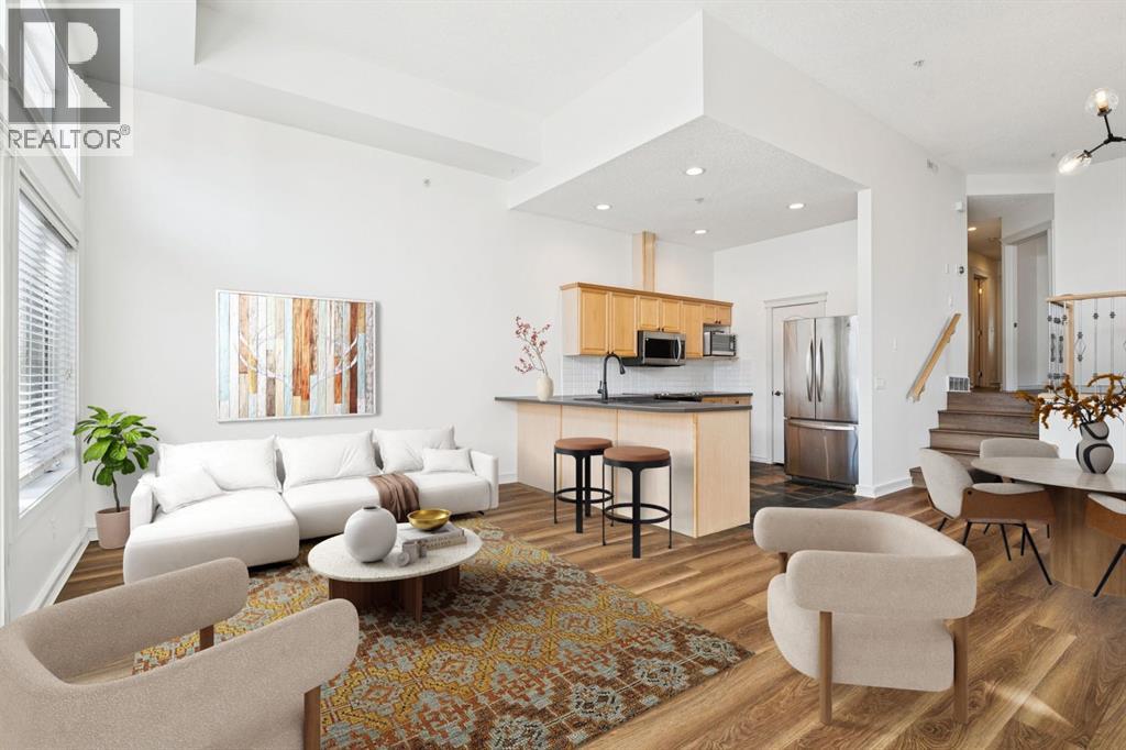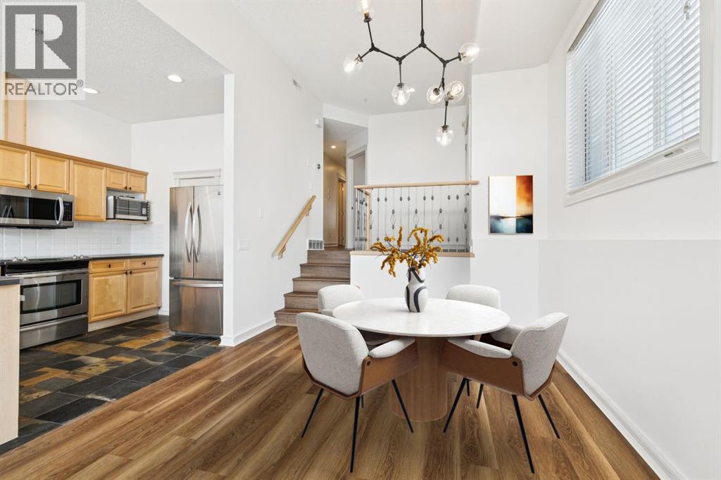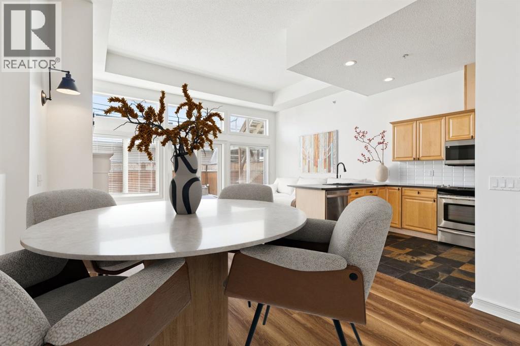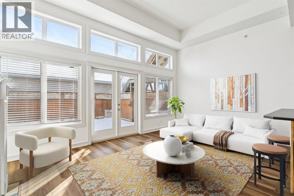 OPEN HOUSE THIS WEEKEND SATURDAY AND SUNDAY. Welcome to comfortable inner-city living in the vibrant community of Killarney. This beautifully maintained bungalow-style townhome offers the perfect blend of style, comfort, and convenience in a quiet residential setting, just moments from the energy of 17th Avenue.Freshly painted throughout, the home feels bright and inviting from the moment you step inside. Large windows fill the space with natural light, highlighting the dramatic 12-foot ceilings, luxury vinyl plank and slate flooring, and the warmth of in-floor heating. The open design creates a welcoming flow that’s ideal for both relaxing and entertaining.The kitchen is thoughtfully designed with an eating bar, pantry, new black double sink, and stylish new backsplash, making it both functional and attractive for everyday living. Just off the main living area, step outside to your cozy, private fenced patio—a perfect spot to enjoy a quiet morning coffee or unwind at the end of the day.This spacious home offers over 1,200 sq. ft. of living space with two bedrooms and a versatile den area ideal for a home office. The generous primary bedroom features a walk-in closet and a private ensuite with a jetted soaker tub and separate shower, creating a comfortable retreat. A second full bathroom adds convenience for guests or family.The well-maintained complex consists of only four units and is self-managed, helping keep condo fees low while maintaining pride of ownership throughout.You’ll appreciate the convenience of your garage parking stall at the rear, along with easy access to 17th Avenue, Crowchild Trail, parks, playgrounds, schools, transit, shops, and restaurants.If you’re looking for bright, low-maintenance inner-city living in one of Calgary’s most loved neighbourhoods, this Killarney gem is a must see. bOOK YOUR APPOINTMENT TODAY. (id:51913)