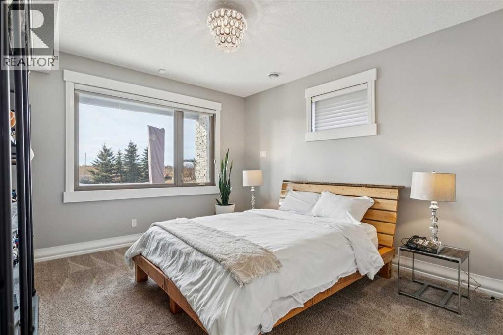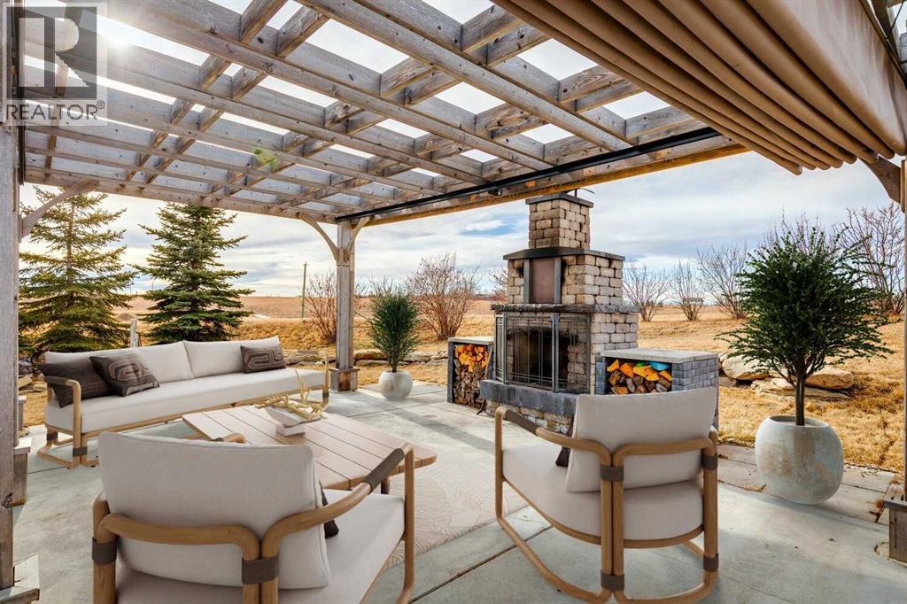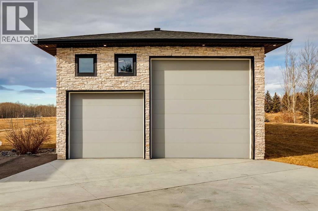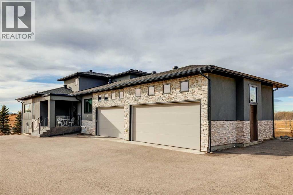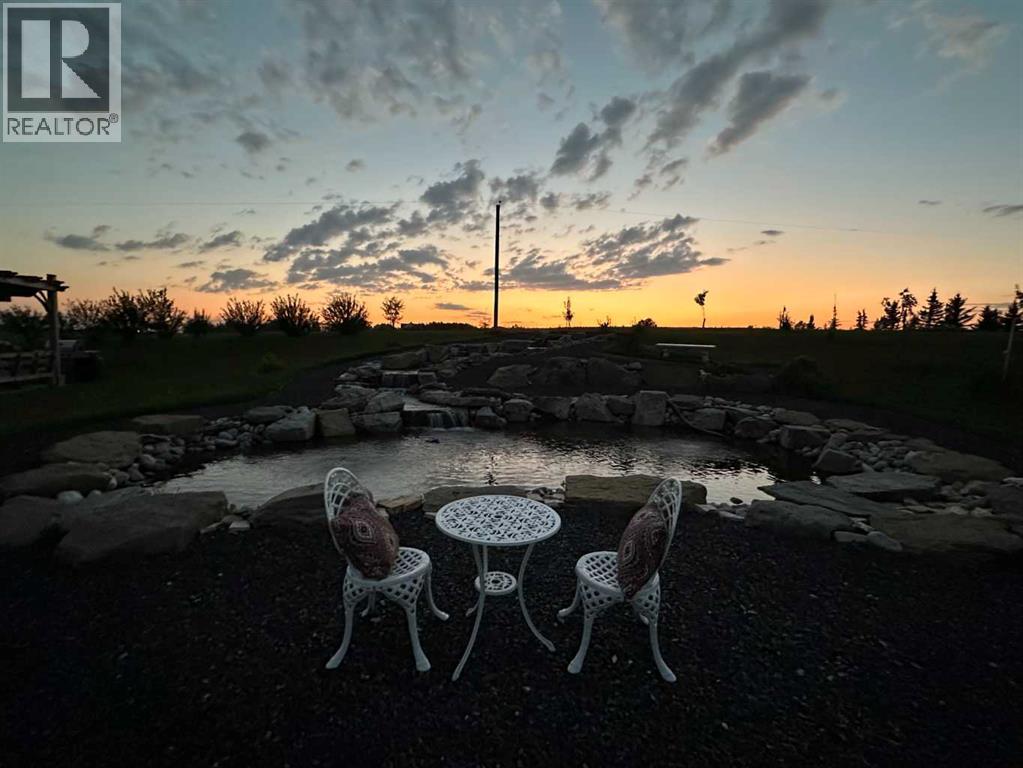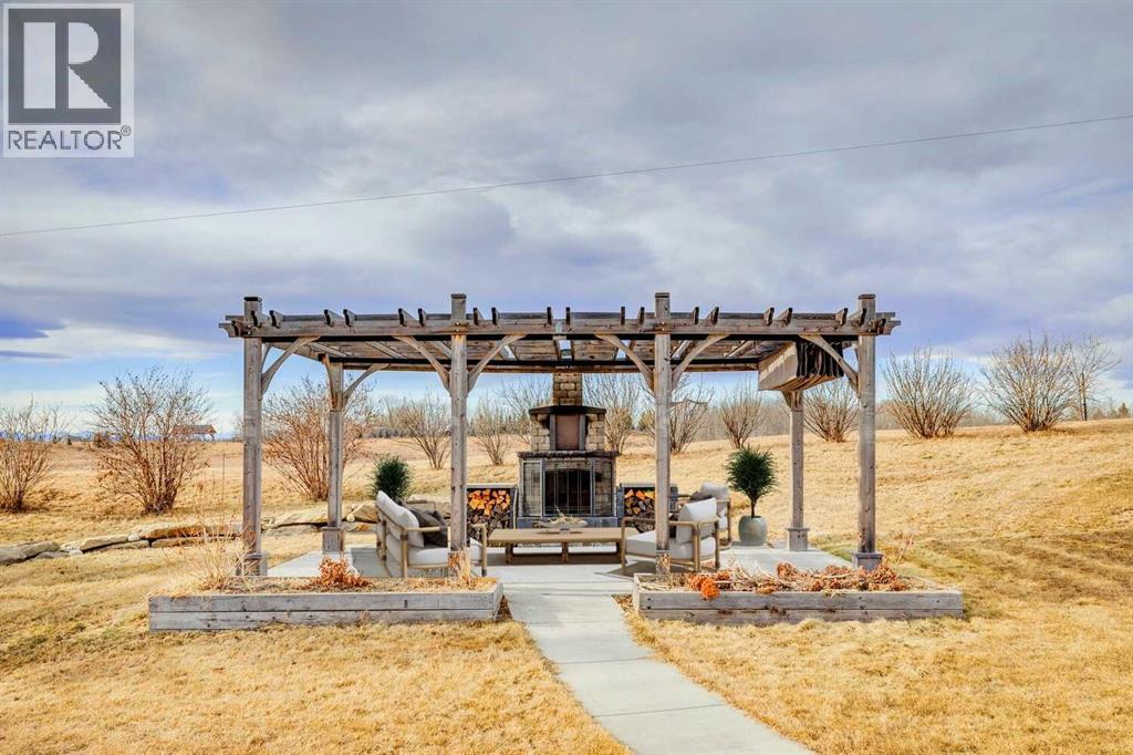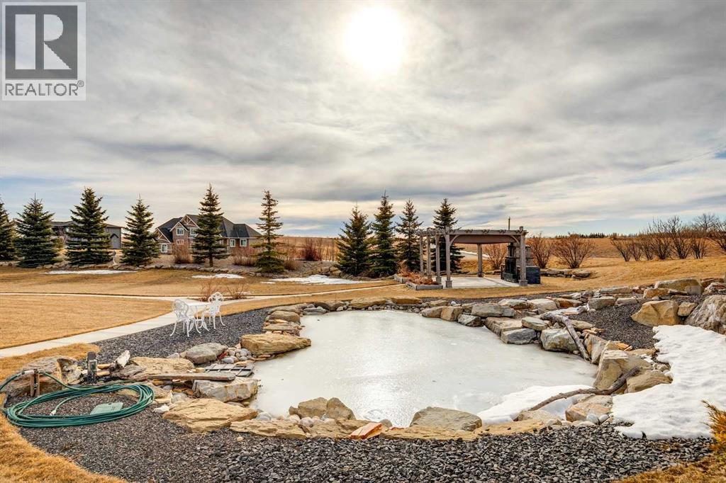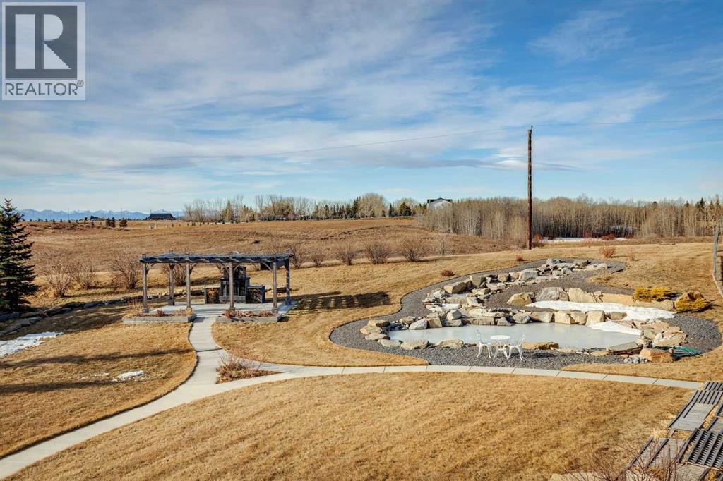 Set on 2 beautifully landscaped acres, this exceptional country residential estate offers a rare blend of luxury construction, high-end mechanical systems, & thoughtfully designed outdoor living, all just 20 minutes from downtown Calgary w/ quick access west to the mountains & positioned to capture breathtaking mountain views, including views enjoyed directly from your kitchen & dining table. The professionally landscaped grounds (completed 4 yrs ago for $110,000) showcase a stunning waterfall feature, rock garden, expansive garden beds, mature fruit orchard w/ apple, cherry, plum, & pear trees, plus saskatoons & raspberries, along w/ a greenhouse & an exterior wood-burning fireplace seating area under a pergola w/ sunshade, all connected by concrete pathways for enhanced accessibility. The property also offers room to park 6 vehicles inside plus an exceptional amount of additional exterior parking, ideal for guests, recreational vehicles, & equipment. The home itself is flooded w/ natural light through extensive windows & features 10-foot ceilings w/ vaulted ceilings in the main living area, solid core interior doors throughout, oak hardwood flooring, in-floor heat, air conditioning (new in 2024 for $10,000), a 2-zone furnace, boiler, & new windows and insulation added in 2025 ($50,000) for improved energy efficiency, w/ the entire home professionally repainted in 2024. The main level offers 2 bedrooms & 2 full bathrooms w/ quartz countertops throughout, including a luxurious primary retreat w/ mountain views, a large walk-in closet w/ built-in shelving, & an elegant ensuite w/ dual sinks, custom tiled shower, & jetted tub, while the living room is anchored by a gas fireplace w/ an oversized tiled feature wall. The chef-inspired kitchen is finished w/ quartz countertops, ceiling-height soft-close cabinetry, under-cabinet lighting, a 5-burner gas stove, in-wall oven, Bosch dishwasher, prep sink, large island, & a spacious walk-in pantry, complemented by a functional mudroom w/ sink & secondary laundry hook-up. The fully developed walk-out basement features a 2nd primary suite w/ covered patio access, dual sinks, quartz counters, tile flooring, oversized tiled shower, jetted tub, & a large custom walk-in closet, plus 2 additional bedrooms (3 total in the basement), a full bathroom w/ steam shower, bench seating, & quartz counters, a wine room, basement laundry w/ shelving, cupboards, & a 2024 dryer, & an expansive recreation space complete w/ surround sound, gas fireplace, & a wet bar w/ quartz counters & light that changes colour. Multiple covered balconies include 2 gas BBQ hook-ups & exterior Bluetooth speakers. The attached quad garage is insulated, drywalled, features 12-foot ceilings, & includes an EV charging panel (charger excluded), while the detached RV shop ($110,000) offers 24x36 dimensions, 14-foot ceilings, a 12-foot RV door, loft, 100-amp service, & 220V power, making this property an exceptional offering in a prestigious price category. (id:51913)