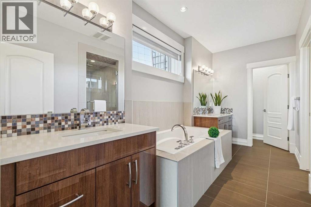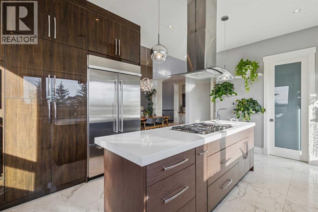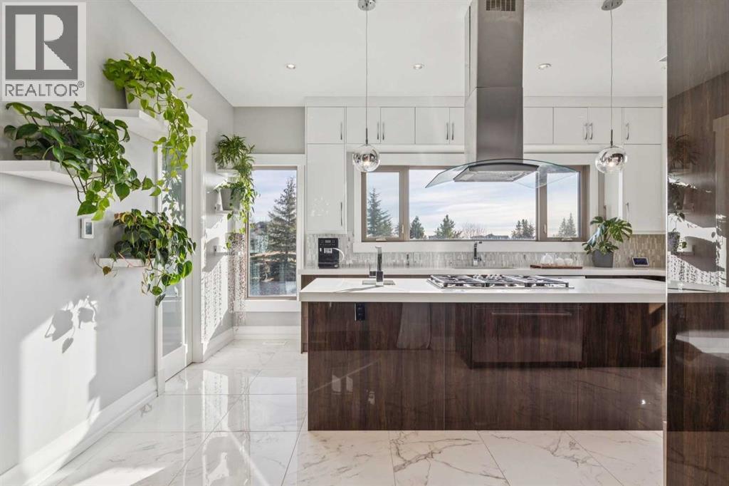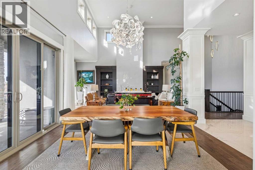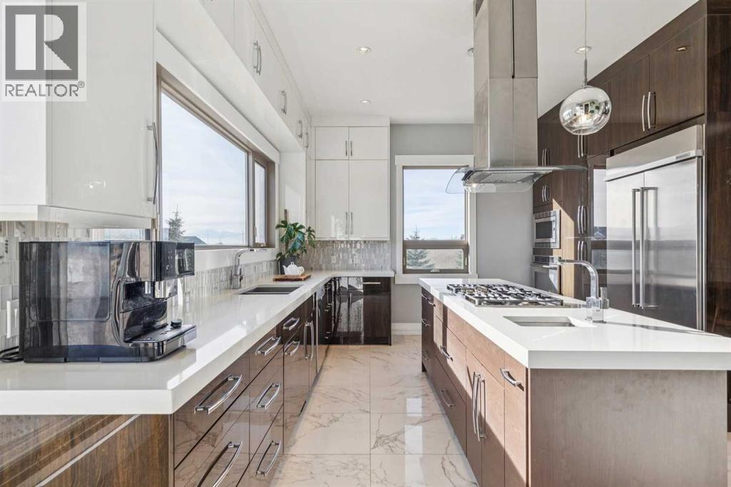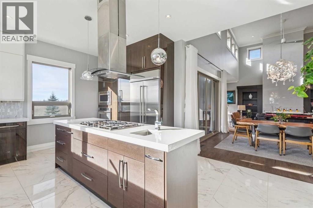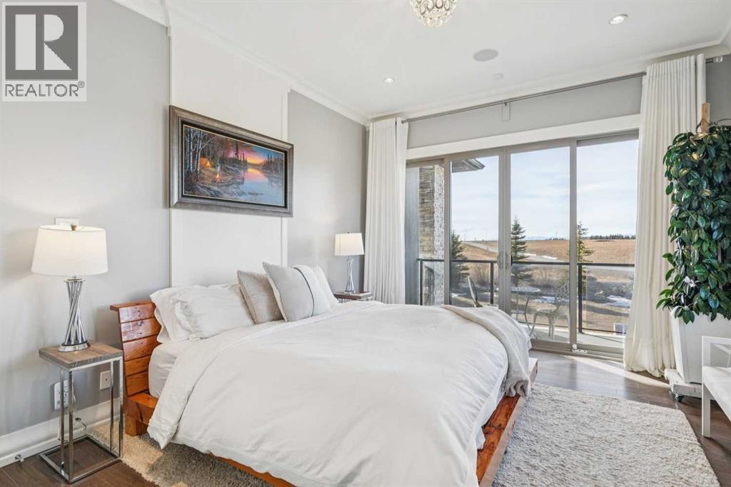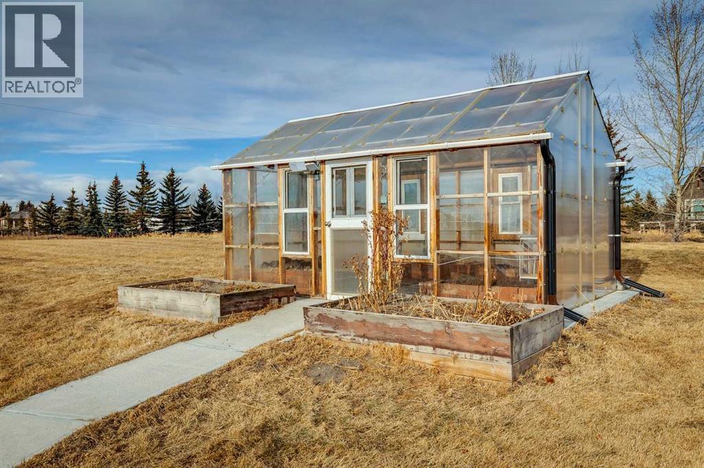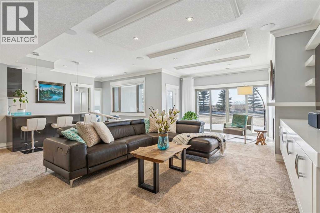 Set on 2 beautifully landscaped acres, this exceptional country residential estate offers a rare blend of luxury construction, high-end mechanical systems, & thoughtfully designed outdoor living, all just 20 minutes from downtown Calgary w/ quick access west to the mountains & positioned to capture breathtaking mountain views, including views enjoyed directly from your kitchen & dining table. The professionally landscaped grounds (completed 4 yrs ago for $110,000) showcase a stunning waterfall feature, rock garden, expansive garden beds, mature fruit orchard w/ apple, cherry, plum, & pear trees, plus saskatoons & raspberries, along w/ a greenhouse & an exterior wood-burning fireplace seating area under a pergola w/ sunshade, all connected by concrete pathways for enhanced accessibility. The property also offers room to park 6 vehicles inside plus an exceptional amount of additional exterior parking, ideal for guests, recreational vehicles, & equipment. The home itself is flooded w/ natural light through extensive windows & features 10-foot ceilings w/ vaulted ceilings in the main living area, solid core interior doors throughout, oak hardwood flooring, in-floor heat, air conditioning (new in 2024 for $10,000), a 2-zone furnace, boiler, & new windows and insulation added in 2025 ($50,000) for improved energy efficiency, w/ the entire home professionally repainted in 2024. The main level offers 2 bedrooms & 2 full bathrooms w/ quartz countertops throughout, including a luxurious primary retreat w/ mountain views, a large walk-in closet w/ built-in shelving, & an elegant ensuite w/ dual sinks, custom tiled shower, & jetted tub, while the living room is anchored by a gas fireplace w/ an oversized tiled feature wall. The chef-inspired kitchen is finished w/ quartz countertops, ceiling-height soft-close cabinetry, under-cabinet lighting, a 5-burner gas stove, in-wall oven, Bosch dishwasher, prep sink, large island, & a spacious walk-in pantry, complemented by a functional mudroom w/ sink & secondary laundry hook-up. The fully developed walk-out basement features a 2nd primary suite w/ covered patio access, dual sinks, quartz counters, tile flooring, oversized tiled shower, jetted tub, & a large custom walk-in closet, plus 2 additional bedrooms (3 total in the basement), a full bathroom w/ steam shower, bench seating, & quartz counters, a wine room, basement laundry w/ shelving, cupboards, & a 2024 dryer, & an expansive recreation space complete w/ surround sound, gas fireplace, & a wet bar w/ quartz counters & light that changes colour. Multiple covered balconies include 2 gas BBQ hook-ups & exterior Bluetooth speakers. The attached quad garage is insulated, drywalled, features 12-foot ceilings, & includes an EV charging panel (charger excluded), while the detached RV shop ($110,000) offers 24x36 dimensions, 14-foot ceilings, a 12-foot RV door, loft, 100-amp service, & 220V power, making this property an exceptional offering in a prestigious price category. (id:51913)