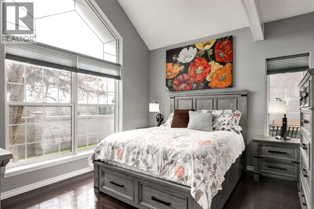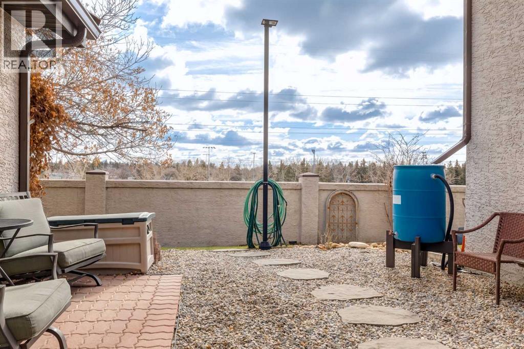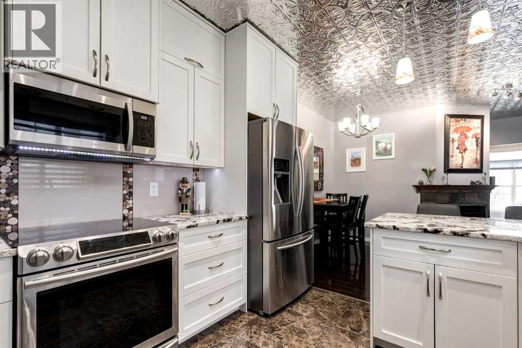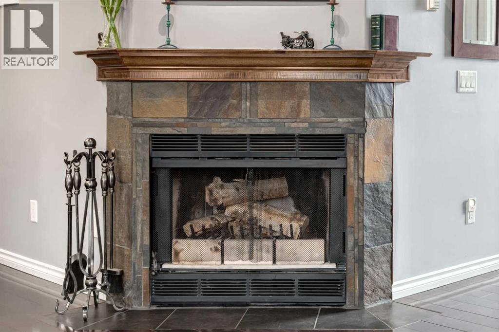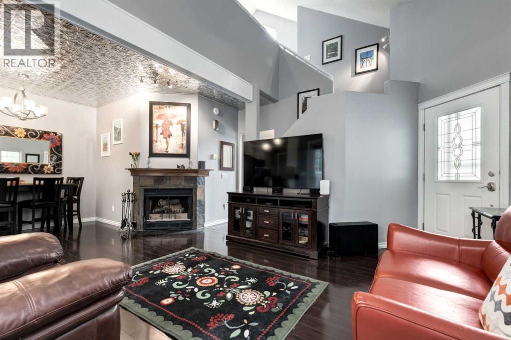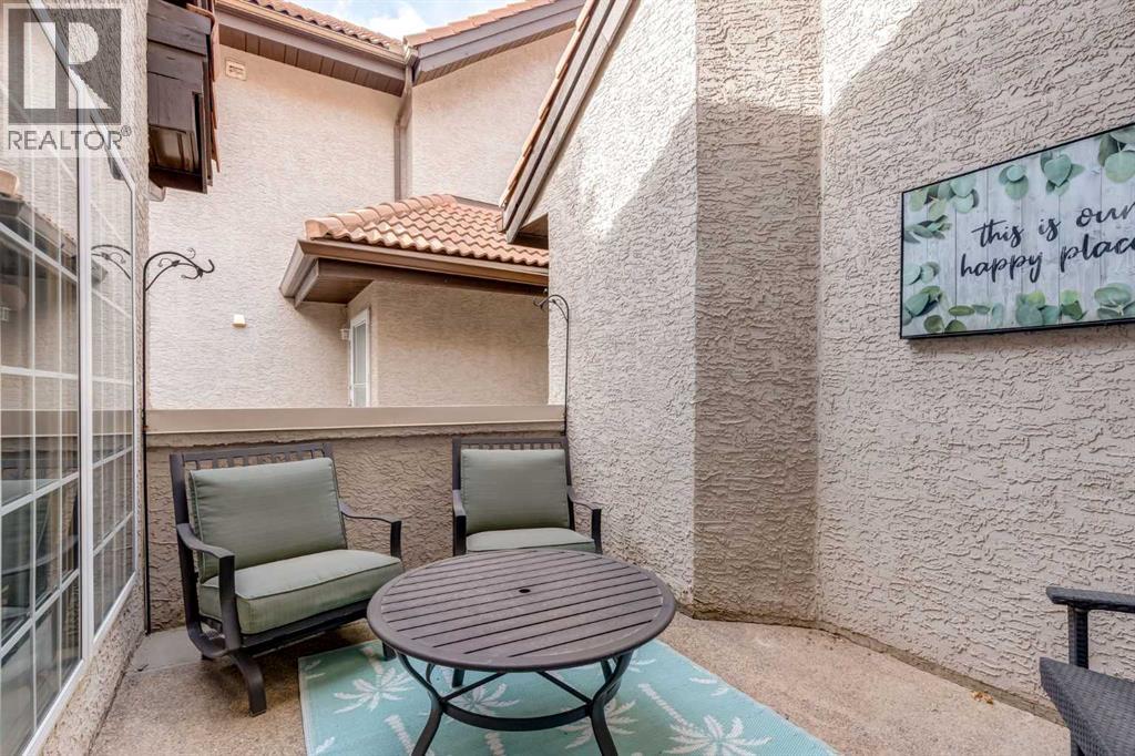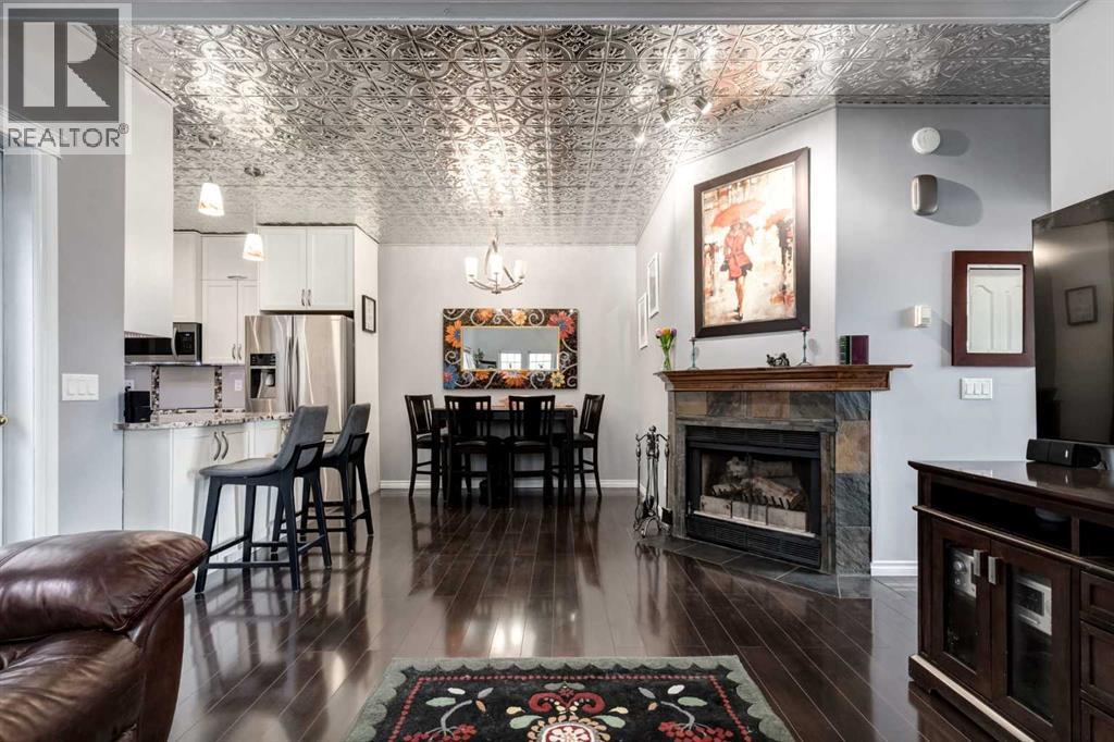 Immaculate fully renovated townhouse with main floor primary bedroom and ensuite. Radiant in floor heat throughout. Living room features dramatic vaulted ceilings, a real wood burning fireplace and access to one of two patios. Kitchen features floor to ceiling cabinets with granite counters 24” porcelain tile, Blanco sink and a breakfast bar. The star of the show is the real pressed tin ceiling that flows through the kitchen and dining area. Vaulted ceilings carry into the Primary bedroom with large windows. Primary ensuite features a walk in shower with Grohe taps and bench, dual vanities and a walk in closet. Upstairs features another bedroom, a full bathroom and a den that could easily be converted into a third bedroom. Heated oversized single garage with additional driveway parking. Pet Friendly complex features a clubhouse with BBQ patio. Walking distance to Sirocco C-train station, shopping and dining. (id:51913)