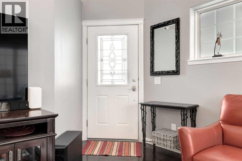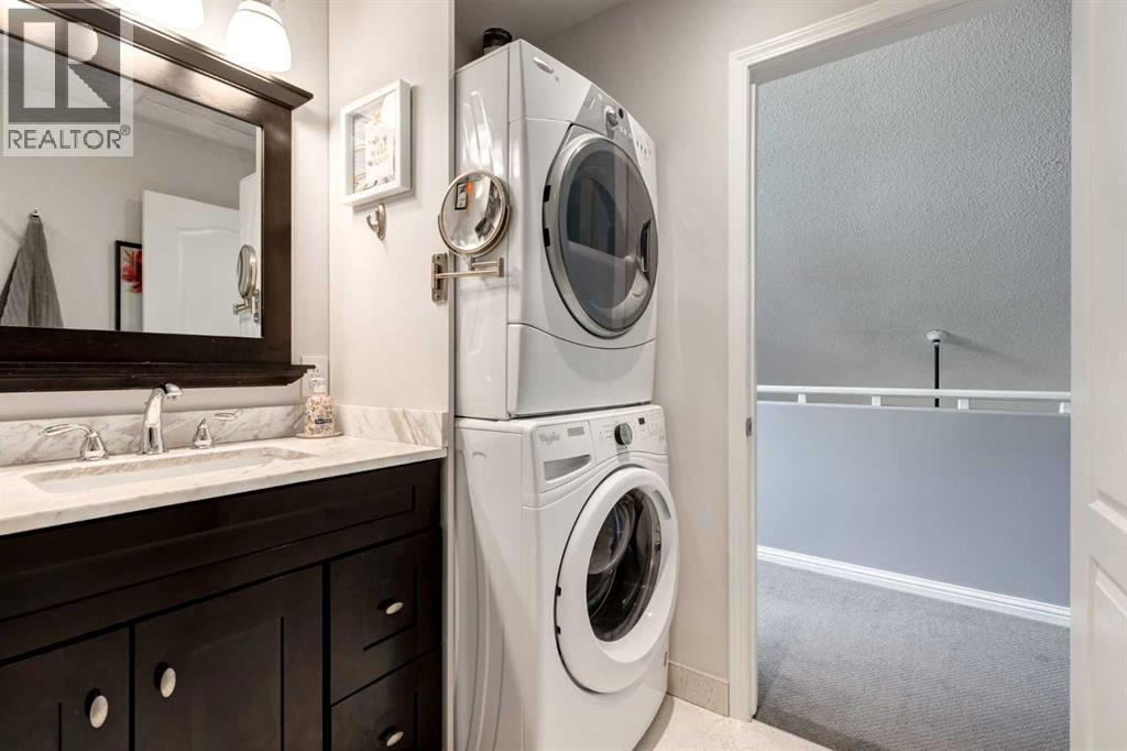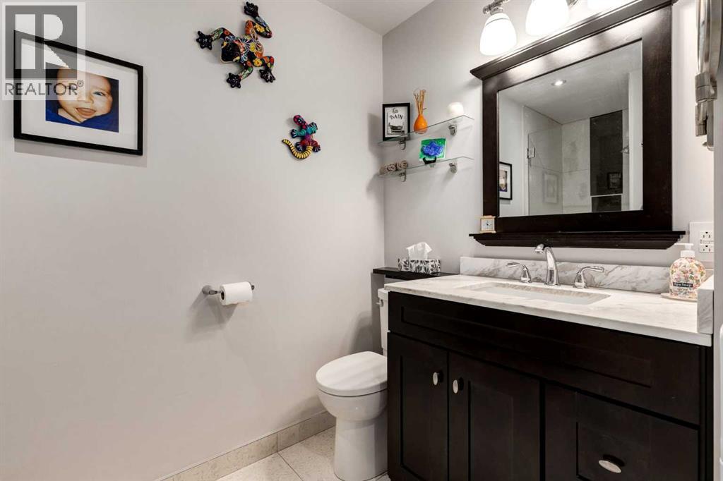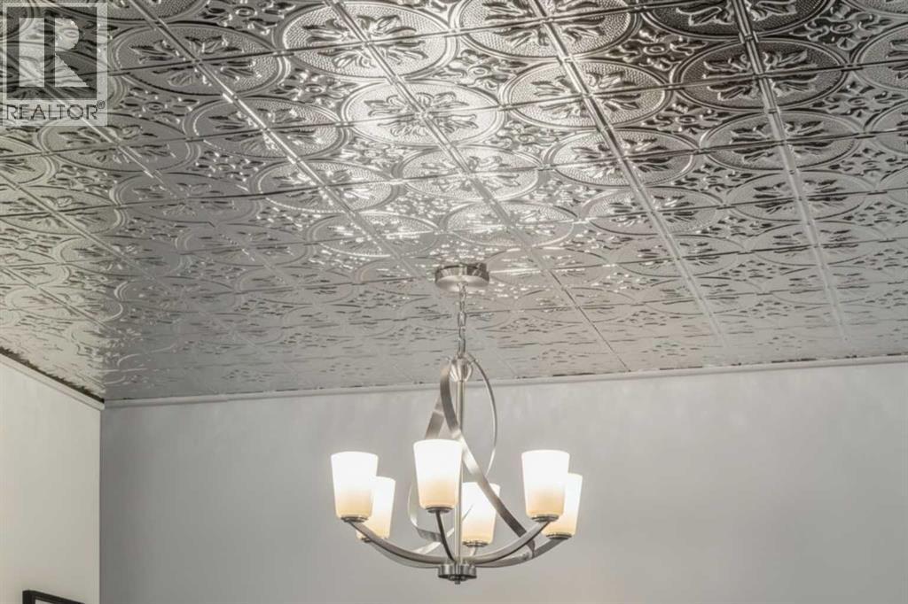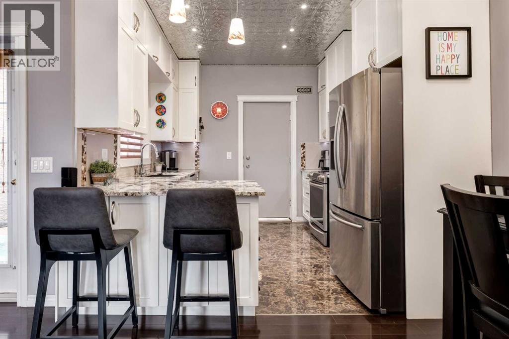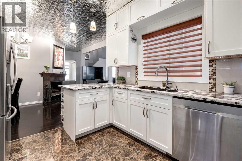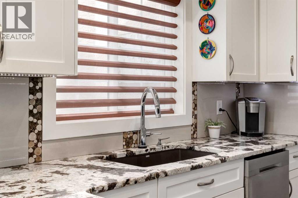 Immaculate fully renovated townhouse with main floor primary bedroom and ensuite. Radiant in floor heat throughout. Living room features dramatic vaulted ceilings, a real wood burning fireplace and access to one of two patios. Kitchen features floor to ceiling cabinets with granite counters 24” porcelain tile, Blanco sink and a breakfast bar. The star of the show is the real pressed tin ceiling that flows through the kitchen and dining area. Vaulted ceilings carry into the Primary bedroom with large windows. Primary ensuite features a walk in shower with Grohe taps and bench, dual vanities and a walk in closet. Upstairs features another bedroom, a full bathroom and a den that could easily be converted into a third bedroom. Heated oversized single garage with additional driveway parking. Pet Friendly complex features a clubhouse with BBQ patio. Walking distance to Sirocco C-train station, shopping and dining. (id:51913)
