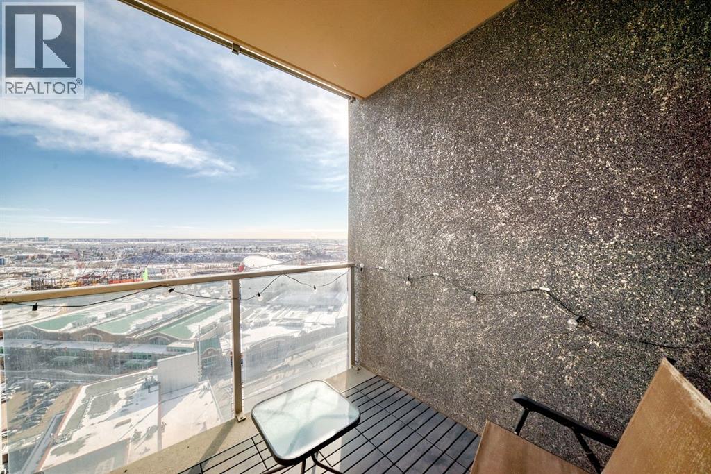 Stunning views from this prestigious 27th floor contemporary condo in sought-after Alura. This meticulously maintained unit is move-in ready and comes with breath-taking view to the southeast. Open concept layout, floor-to-ceiling windows allow for sunlight to flood this 9-foot ceiling unit. Kitchen boasts ample cupboard and counter space, stainless steel appliances and a convenient breakfast bar. Spacious dining and living room are good for entertaining. Relax in your balcony with morning coffee, unwind after work or enjoy unobstructed firework at Stampede time. Included also are in-suite laundry, underground titled parking, assigned storage locker, central air-conditioning, tons of visitor parking, bike storage room, concierge / security service, state of the art fitness facility, 2 gyms. Beautiful outdoor terrace to enjoy in summer. Excellent location close to C-train, buses, grocery stores, Stampede Park. Walk to 17th avenue, downtown and top-rated restaurants. This is urban living at it finest. Don't miss the only one-bedroom available in Alura building! (id:51913)