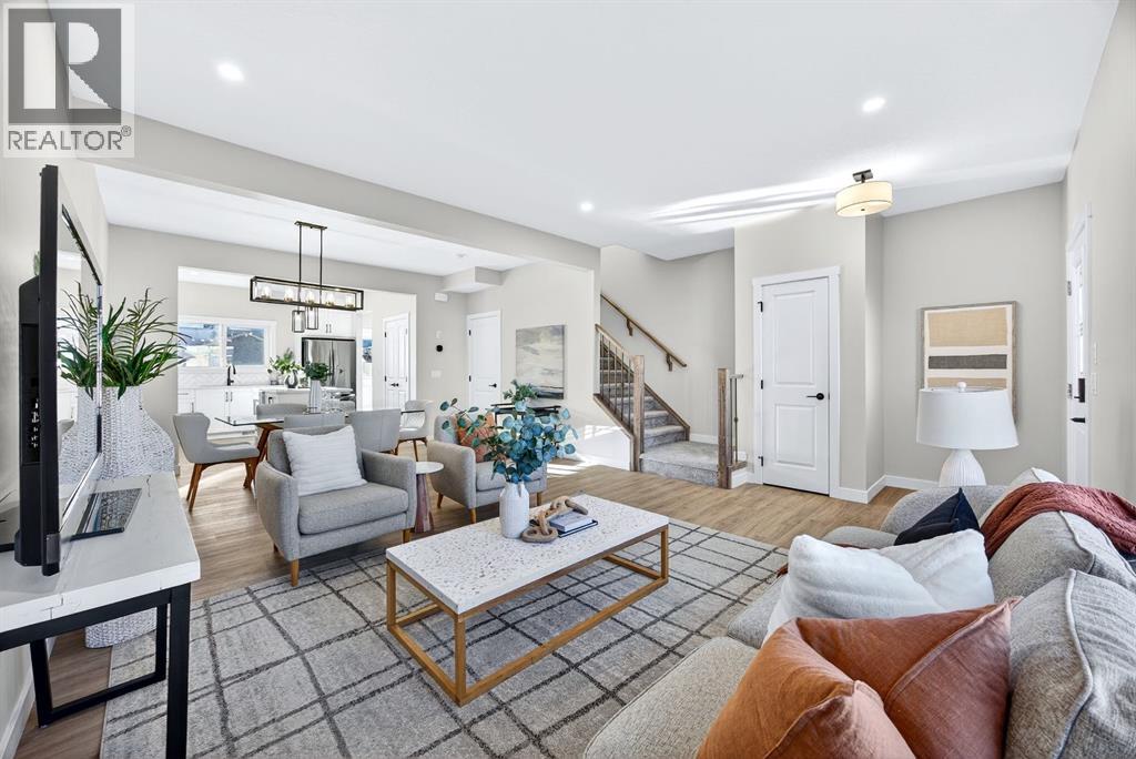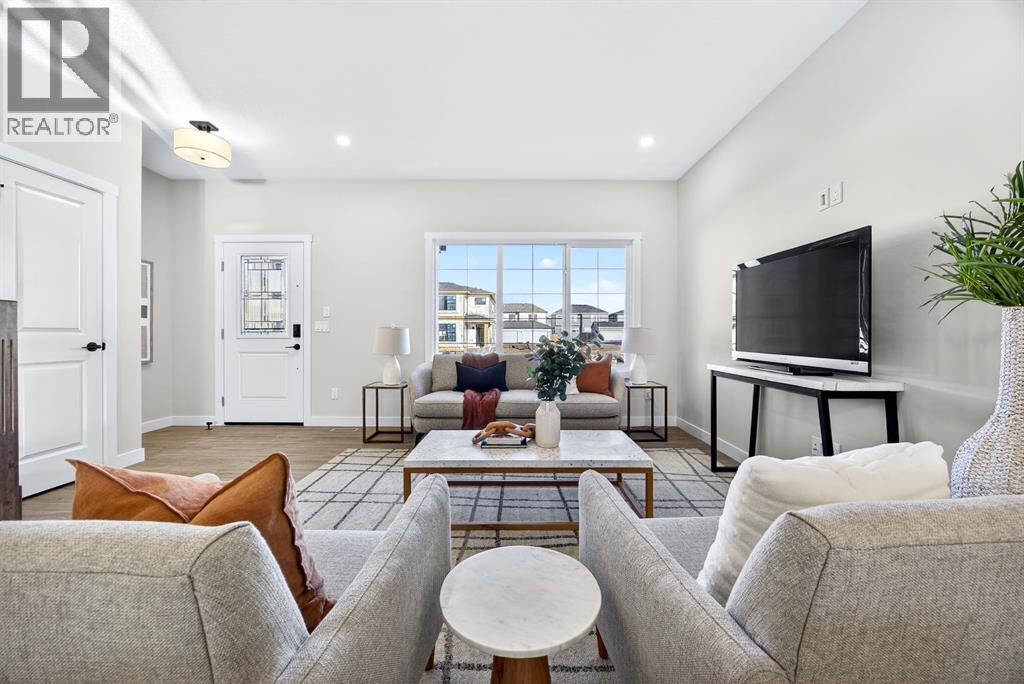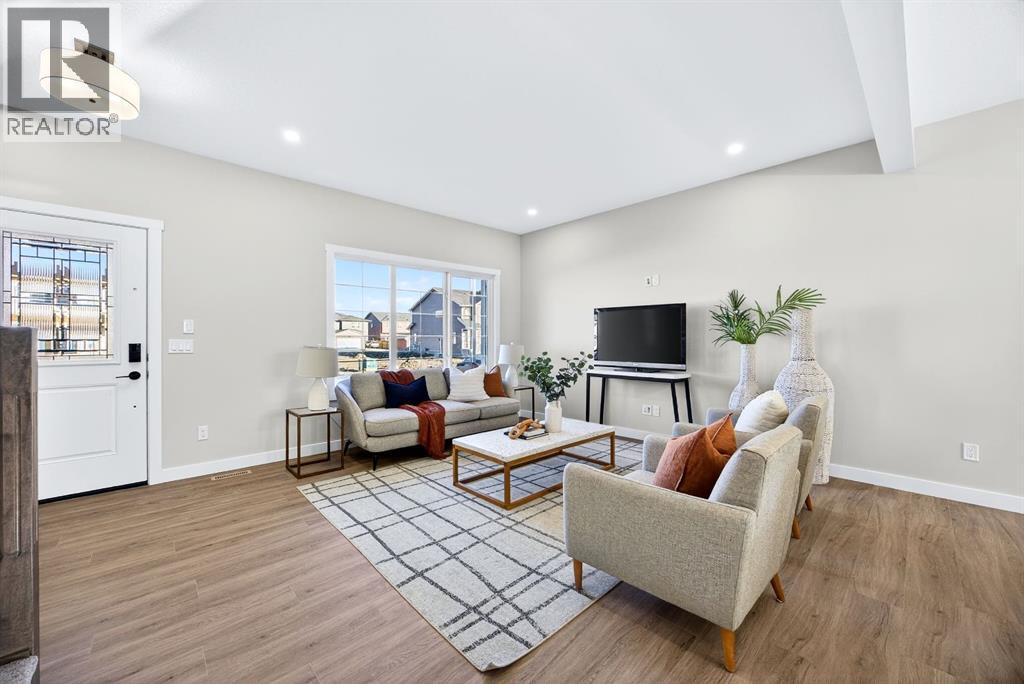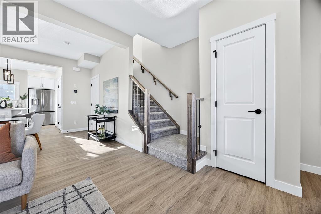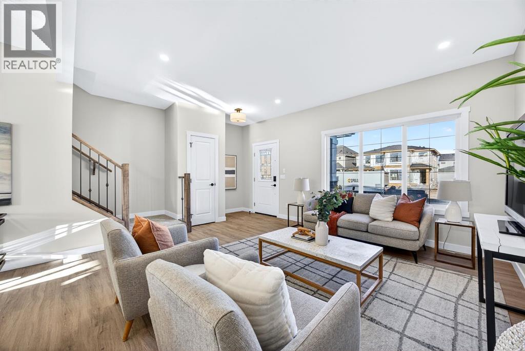 Welcome to this stunning, brand-new Genesis Builders duplex. The "Oscar" offers modern design, functional living, and exceptional future potential with basement suite rough-ins, all complemented by a warm, inviting colour palette that creates a welcoming atmosphere throughout the home. Featuring 3 bedrooms and 2.5 bathrooms, this home is thoughtfully crafted and offers over 1400 sq ft. The main floor showcases a bright, sun-filled floorplan with 9' ceilings and a seamless open-concept layout, connecting the spacious living room, central dining area, and stylish kitchen. The kitchen is beautifully appointed with quartz countertops, two-toned cabinetry, a large central island, and a sleek stainless steel appliance package, complete with a gas line to the range. A convenient powder room completes the main level. Upstairs, the primary suite is a private retreat featuring a generous walk-in closet and a spa-inspired ensuite with his-and-hers sinks and an oversized shower. Two additional well-sized bedrooms, a full bathroom, and convenient upper-floor laundry complete the second level. The unfinished basement offers incredible flexibility with 9' ceilings, a separate SIDE ENTRANCE, and BASEMENT SUITE ROUGH INs, making it ideal for additional living space or future income potential. Outside, the backyard is a blank canvas, ready for your personal touch and offering the opportunity to build your dream garage. Located in the vibrant and family-friendly community of Fireside, this home offers the perfect balance of small-town charm and modern convenience. Fireside is known for its extensive pathway system, parks, playgrounds, and green spaces, ideal for walking, biking, and outdoor enjoyment. Residents love the easy access to schools, shops, restaurants, and everyday amenities, all just minutes away. With quick access to Highway 22 and Highway 1, commuting to Calgary or heading west to the mountains is effortless. *Taxes have not been assessed. Photos are representative of th e same model. This property's colour palette is included in the pictures. RMS has been applied to the builder's construction drawings. (id:51913)
