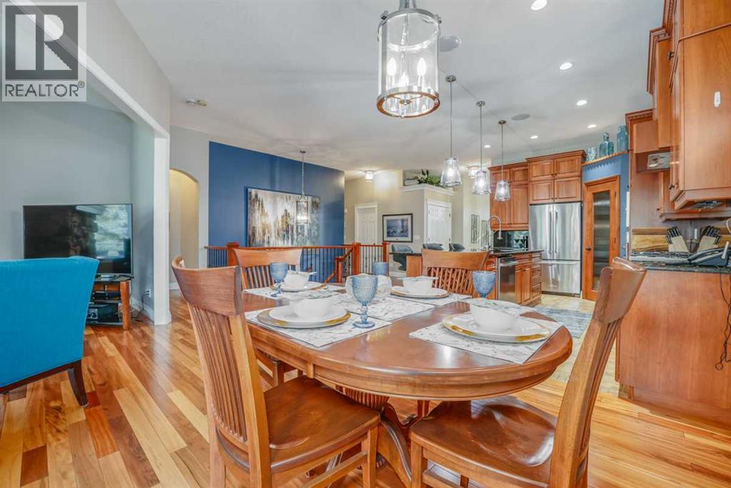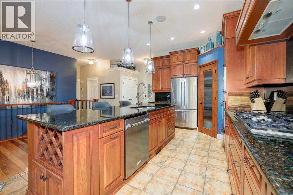 "WELCOME TO YOUR DREAM HOME" An exquisite custom walkout bungalow nestled on an exquisite, landscaped lot, on a quiet culdesac backing onto beautiful Crystal Ridge Golf Course. The home features vaulted ceilings, tigerwood hardwood floors, air conditioning, and numerous extras. The spacious open design includes a living/family room with a gorgeous stone fireplace for cozy evenings, a lovely dining area for formal times, a chef's gourmet haven including a gas range, a built-in oven & warmer, loads of cupboards, granite counters, walk in pantry, and a fantastic huge island for entertaining. The primary bedroom features a walk in closet and five piece ensuite complete with a therapeutic air bath tub. Eating area has access to the wrap around deck to enjoy the beautiful privacy and the evening sun. For convenience, laundry and a powder room on main floor. Lower walkout level features a family/games/theatre room for enjoyable fun times. There are an additional two bedrooms, an office/den, and three piece bathroom, as well as space for a gym. The patio area features a beautiful hot tub, and steps away, a cozy firepit. The numerous extras include underground sprinkler system, Allure outside lighting, water lines in garage and on deck, air conditioning, all closets with auto lights, surround system upstairs in living & dining room, kitchen, ensuite and upper & lower deck, movie system downstairs with sub-woofer, and natural gas outlets on both upper & lower decks. Recent upgrades include roof shingles (2017), fridge with water & ice (2023), dishwasher (2024), microwave (2024), vacu flo (2023), new in slab heating pump (2024), 75 gallon hot water tank (2024), new blinds (2023). This home is located in a quiet long culdesac with a west facing back yard in beautiful Okotoks. The annual HOA gives access to Crystal Shores lake just blocks away. Don't miss viewing this lovely home, its PRECIOUS! No sign on property. (id:51913)