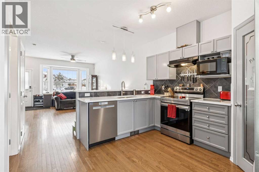 Nicely upgraded 3 bedroom townhome backing on green space with playground across the street! Upgrades include hardwood floors throughout the main, beautiful quartz counters with newer S/S appliances and fresh paint on the main floor and stairwell. The main floor also has 9ft ceilings and large bay windows front and back and a full size walkin pantry in the beautiful kitchen. There is a sunny breakfast nook at the rear and a 2pce powder room off to the side. Upstairs features 3 bedrooms with the huge primary having a walkin closet and a shared 4pce ensuite. The unfinished basement is great for storage, has the laundry area, and roughed in plumbing for future development. This unit also has a nice deck off the rear with extra storage below. (id:51913)