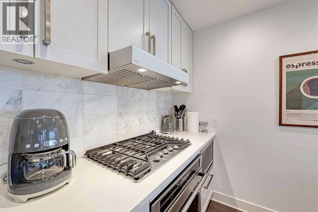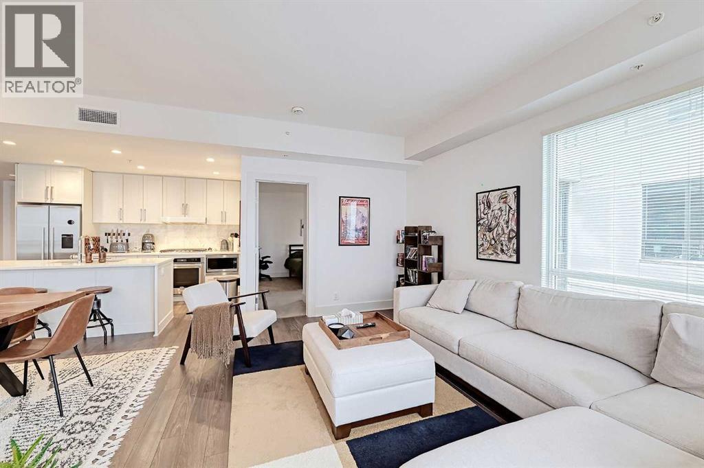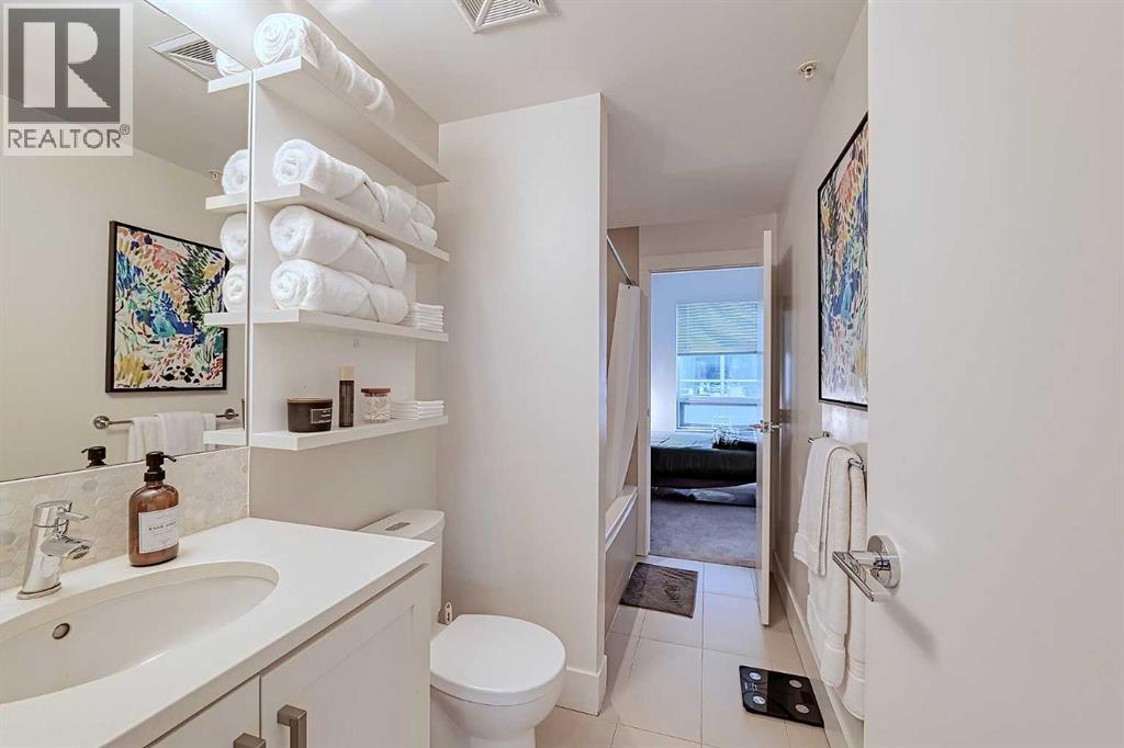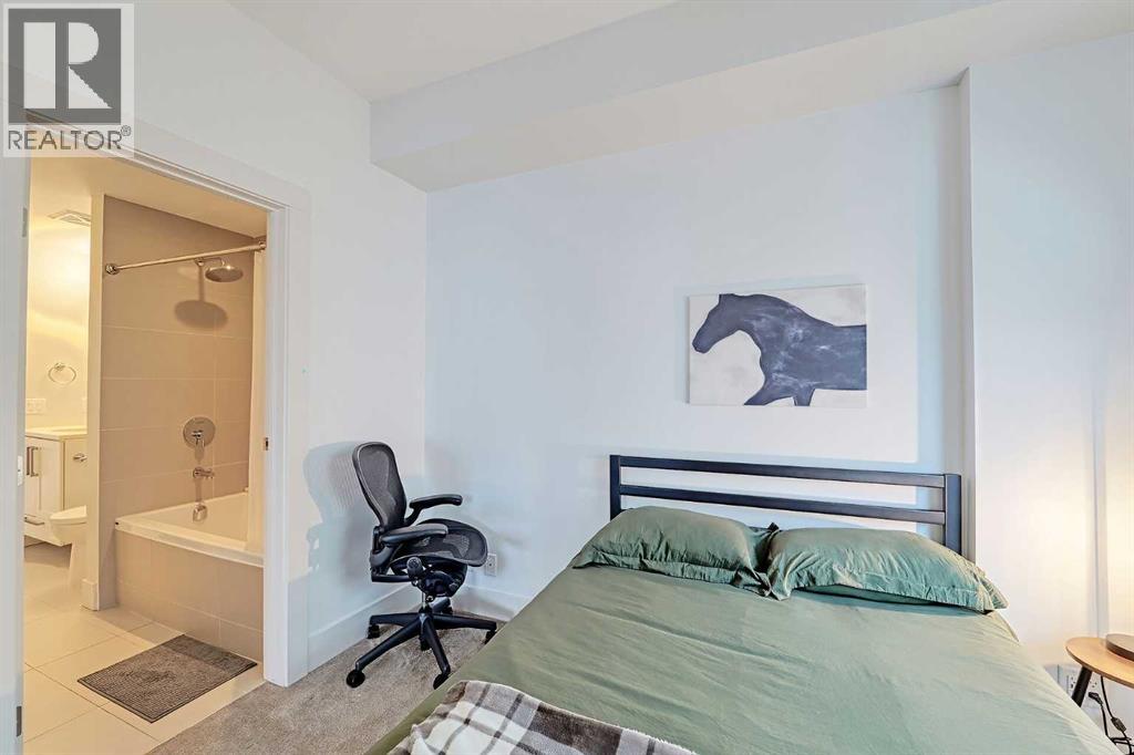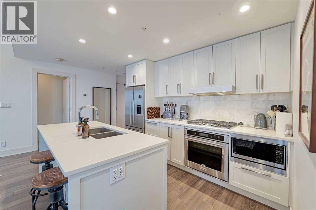 Welcome to Bridgeland Crossing. The downtown and Calgary Tower views from this 7th floor west facing condo are truly amazing. Located in the vibrant community of Bridgeland you are literally steps to shopping, parks and transit. With over 1000 sq ft he wide open plan features an island kitchen with eating bar, stainless steel appliances, quartz countertops, gas cooktop, built-in microwave, built-in dishwasher and double sinks. The spacious living room also has amazing west and SW views. The primary bedroom has plenty of room for all your furniture and and boasts a 4 piece ensuite with double sinks and a oversize shower. The second bedroom is also a good size and has a cheater access to the main 4 piece bath with soaker tub. You will love the west facing balcony. with gas bbq hookup, for evening cocktails or enjoying the Stampede fireworks. Some of the amenities the building features include two fitness centres, a yoga studio, owners lounge/Theatre room, community gardens, an outdoor patio with putting green and BBQs, a dog wash station, bike hub, and guest suite. Also included is a storage unit on the same floor for easy access. This complex is ideally located with quick access to trendy shops, cafés, the Bow River Pathway, and the Bridgeland C-train. (id:51913)