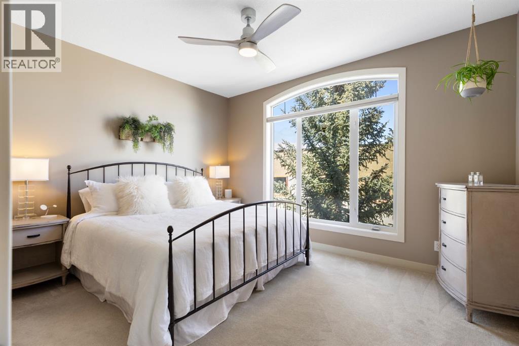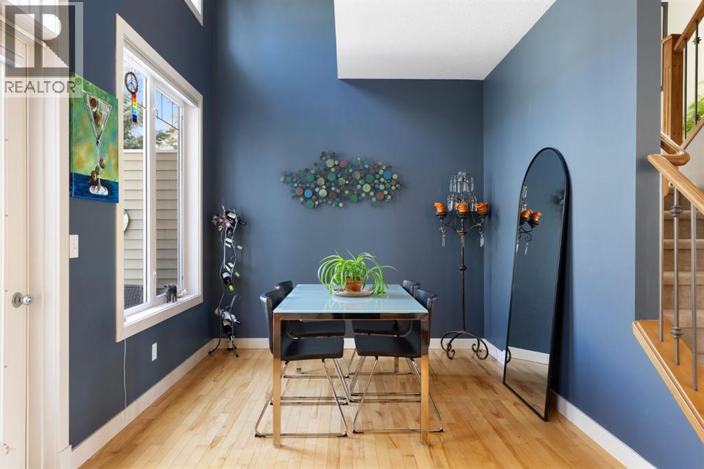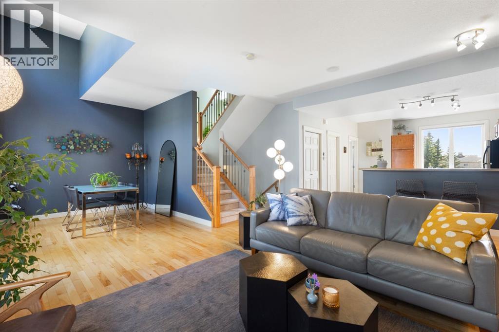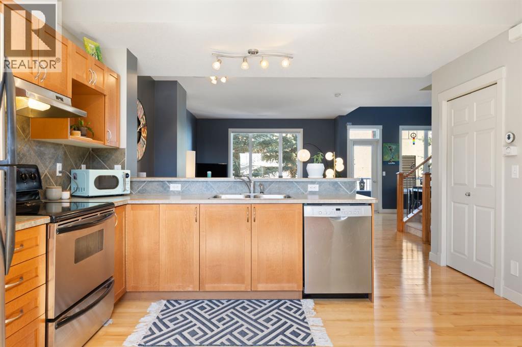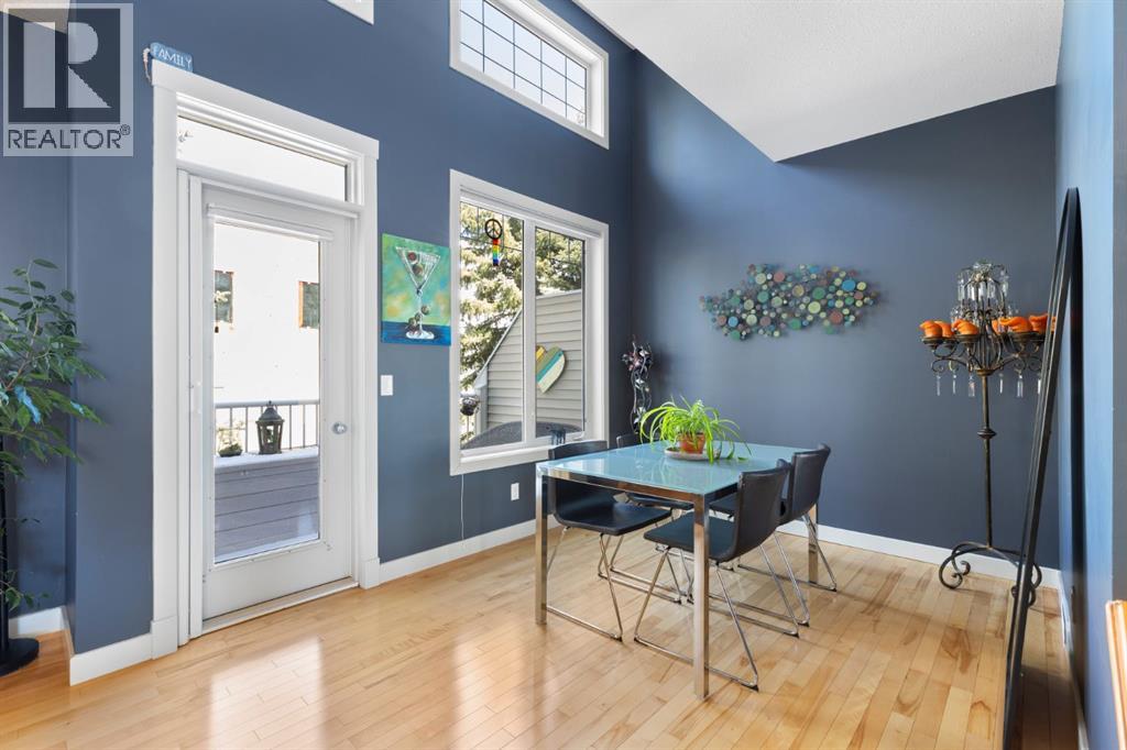 Rare in both size and finish, this thoughtfully cared-for 3-bedroom, 2.5-bathroom townhome in West Springs is one of the largest floor plans in the complex and offers a lifestyle that genuinely delivers. Rich, dark luxury paint tones set a sophisticated tone the moment you walk through the door, flowing through a main level designed for real connection. Hardwood floors run underfoot, 9-foot ceilings open the space above you, and oversized windows pull in natural light all day long. The large living room is wired for surround sound and flows seamlessly into the rest of the main level, built for movie nights, game days, and everything in between. The very large open-concept kitchen is the heart of the home, offering an abundance of storage, plenty of counter space, stainless steel appliances, and an eat-up breakfast bar perfect for busy mornings or casual entertaining. The dining area has high ceilings and walks out to a private balcony, ideal for morning coffee or a slow summer dinner. A two-piece powder room is tucked conveniently off the kitchen, and the utility room is fully equipped with a full-sized washer and dryer and a water softener, practical details that make daily life easier from day one. Upstairs, the primary suite is your retreat, a fully outfitted walk-in closet and a full ensuite bathroom give you the space and privacy you deserve. Two additional bedrooms share another full bathroom, offering flexible options for family, guests, or a dedicated home office. A second upper-level balcony adds a quiet outdoor escape and the opportunity for a cross breeze in summer. Drive directly into your single attached garage with room for extra storage, plus a second parking spot on the extended private driveway. This is a very well managed and financially stable condo corporation, the kind of community where things get taken care of. The condo fees cover landscaping, snow removal, ice management, and exterior maintenance, so your weekends stay yours. Pets are welc ome too.The location is hard to beat. Walk to groceries, restaurants, cafés, and everyday essentials. St. Joan of Arc, West Springs, and West Ridge schools are all nearby, along with a playground and playfield just steps from your door. A new YMCA with lap swimming is on the way. Quick access to Bow Trail and Stoney Trail puts downtown, the mountains, and the airport within easy reach, and the LRT is just 5 minutes away. Move-in ready. Low maintenance. Prime West Springs location. Book your showing today. (id:51913)