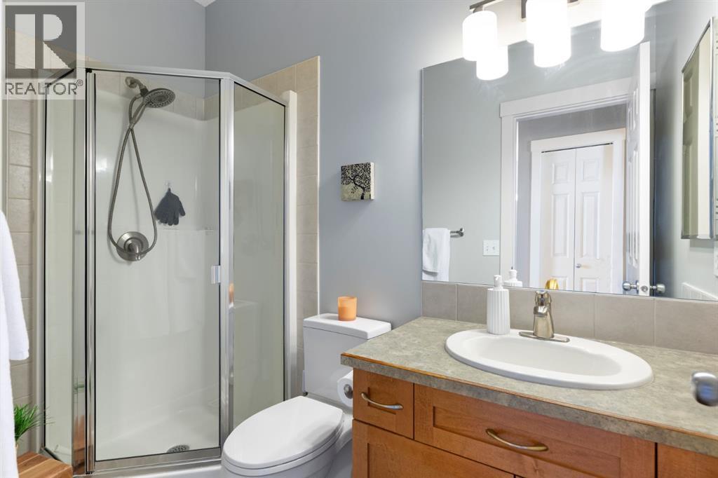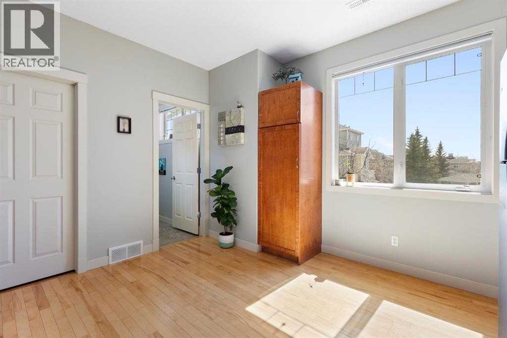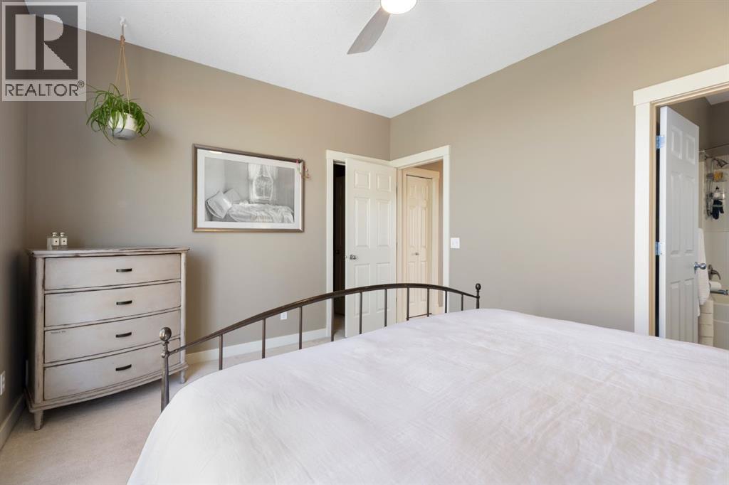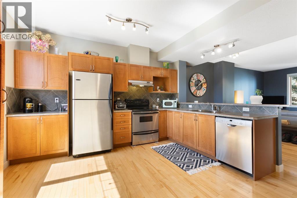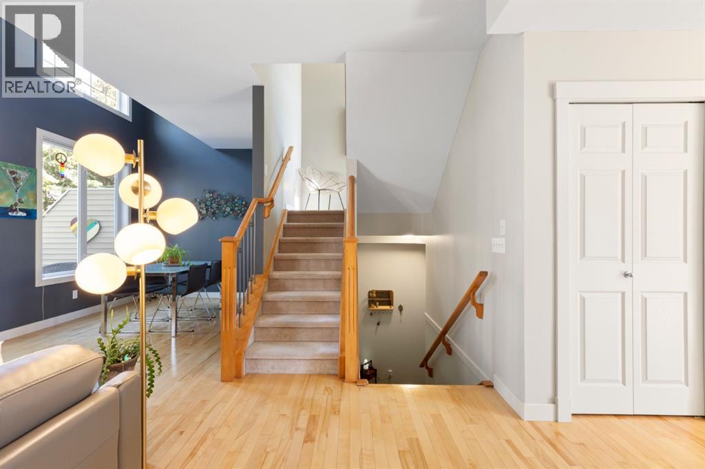Rare in both size and finish, this thoughtfully cared-for 3-bedroom, 2.5-bathroom townhome in West Springs is one of the largest floor plans in the complex and offers a lifestyle that genuinely delivers. Rich, dark luxury paint tones set a sophisticated tone the moment you walk through the door, flowing through a main level designed for real connection. Hardwood floors run underfoot, 9-foot ceilings open the space above you, and oversized windows pull in natural light all day long. The large living room is wired for surround sound and flows seamlessly into the rest of the main level, built for movie nights, game days, and everything in between. The very large open-concept kitchen is the heart of the home, offering an abundance of storage, plenty of counter space, stainless steel appliances, and an eat-up breakfast bar perfect for busy mornings or casual entertaining. The dining area has high ceilings and walks out to a private balcony, ideal for morning coffee or a slow summer dinner. A two-piece powder room is tucked conveniently off the kitchen, and the utility room is fully equipped with a full-sized washer and dryer and a water softener, practical details that make daily life easier from day one. Upstairs, the primary suite is your retreat, a fully outfitted walk-in closet and a full ensuite bathroom give you the space and privacy you deserve. Two additional bedrooms share another full bathroom, offering flexible options for family, guests, or a dedicated home office. A second upper-level balcony adds a quiet outdoor escape and the opportunity for a cross breeze in summer. Drive directly into your single attached garage with room for extra storage, plus a second parking spot on the extended private driveway. This is a very well managed and financially stable condo corporation, the kind of community where things get taken care of. The condo fees cover landscaping, snow removal, ice management, and exterior maintenance, so your weekends stay yours. Pets are welc ome too.The location is hard to beat. Walk to groceries, restaurants, cafés, and everyday essentials. St. Joan of Arc, West Springs, and West Ridge schools are all nearby, along with a playground and playfield just steps from your door. A new YMCA with lap swimming is on the way. Quick access to Bow Trail and Stoney Trail puts downtown, the mountains, and the airport within easy reach, and the LRT is just 5 minutes away. Move-in ready. Low maintenance. Prime West Springs location. Book your showing today. (id:51913)