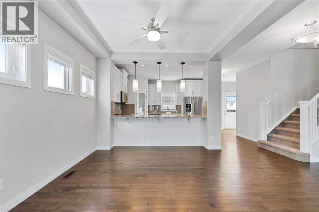 Located just 15 minutes south of Calgary in the welcoming town of Okotoks, this wonderful two-storey home sits on a desirable corner lot in the sought-after community of Drake Landing. The location offers exceptional convenience with nearby playgrounds, parks, schools, shopping, and the local golf course all just minutes away. The bright and inviting main floor features an open-concept layout designed for comfortable everyday living and entertaining. Beautiful hardwood flooring flows through the living room, dining area, and kitchen, while the living room is anchored by a cozy gas fireplace with tile surround and a classic mantle. The kitchen is filled with natural light and showcases granite countertops along with an extended counter that is perfect for breakfast seating or meal preparation. The main floor is completed with a convenient 2-piece powder room and a door leading to the ample south-facing deck that overlooks the green space of Green Haven Estates, creating a peaceful outdoor setting to relax or entertain. At the rear of the property there is a parking pad, with the option to build a garage in the future if desired. The second level features a spacious primary bedroom with large windows, a walk-in closet, and a 4-piece ensuite bathroom. A generous family room provides an excellent space for watching TV or could easily be converted into a third upstairs bedroom if needed. This level is completed with a second bedroom, another 4-piece bathroom, and a well-sized laundry room for added convenience. The developed basement adds even more living space and includes a comfortable living area with built-in cupboards and counters, a third bedroom, and a 4-piece bathroom. With its functional layout, great location, and flexible living spaces, this property is an excellent opportunity for families looking to enjoy all that Okotoks and the Drake Landing community have to offer. (id:51913)