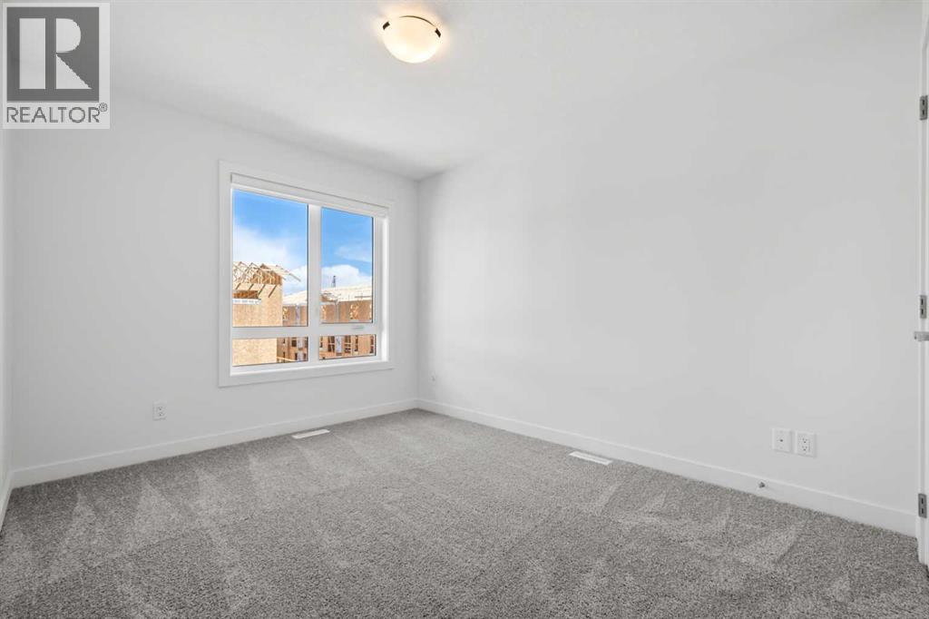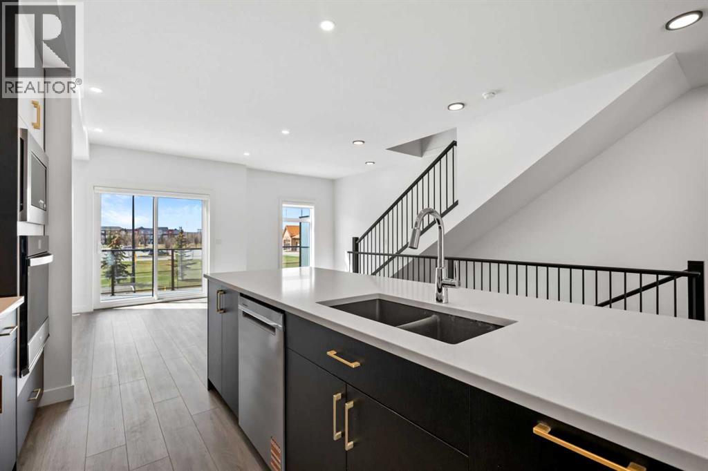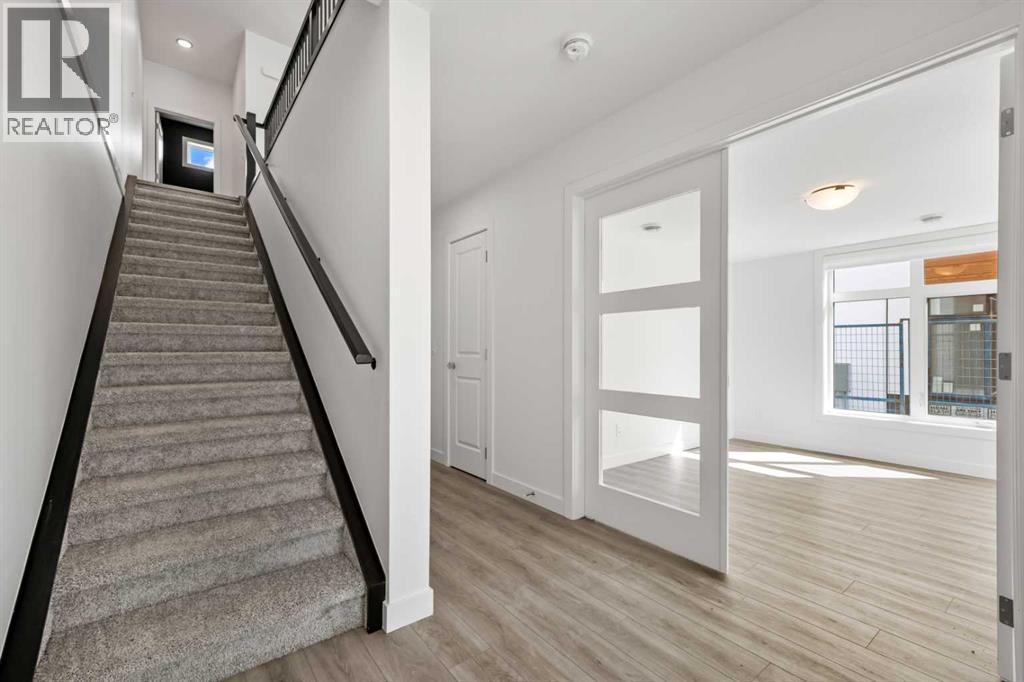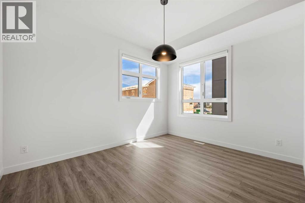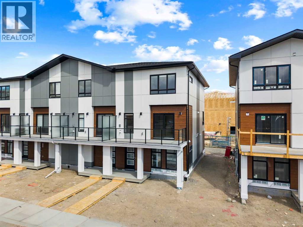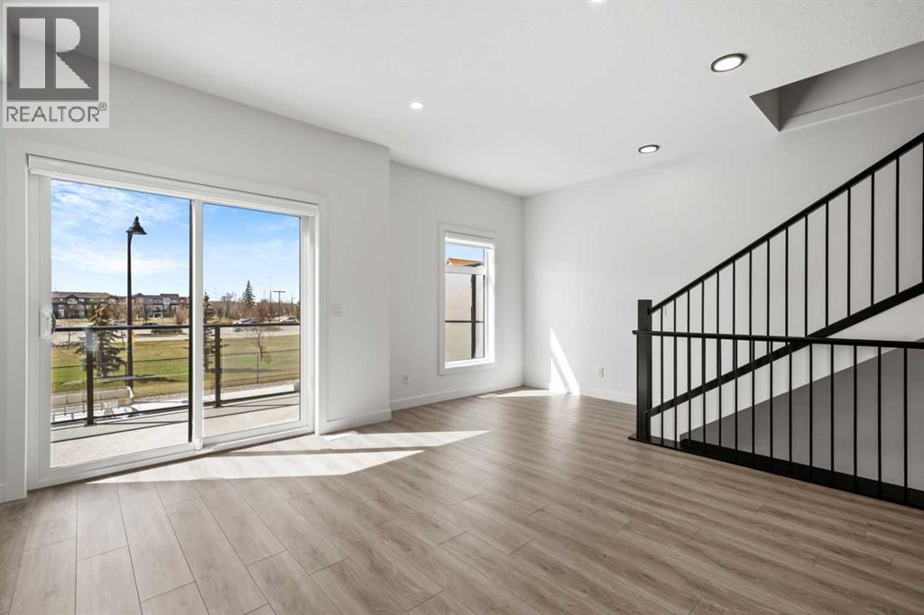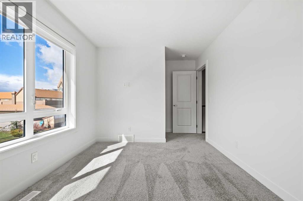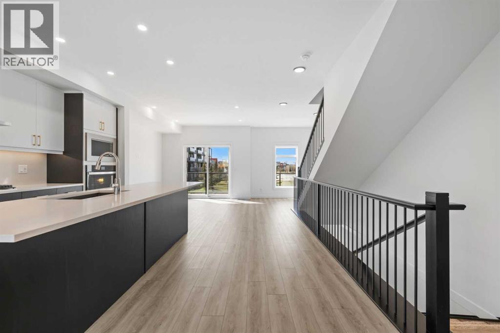 Experience elevated urban living in West Springs with this brand-new, never-occupied three-storey townhouse offering over 2,340 sq. ft. of total living space, sophisticated upgrades, and an unbeatable west Calgary location. Thoughtfully designed with 3 bedrooms, 2.5 bathrooms, a private office/flex space, and a double attached garage, this home blends modern style with everyday functionality.The entry level features a versatile private office/flex room enclosed with elegant double French glass doors, making it ideal for working from home, a fitness space, or additional lounge area. From here, enjoy direct access to the double attached garage and convenient guest street parking on a quiet road.The main living level showcases a bright open-concept layout with oversized windows that flood the home with natural light. Stylish luxury vinyl plank flooring, modern metal railings, upgraded lighting, and a striking dark and moody designer colour palette create a sophisticated atmosphere throughout. The beautifully appointed two-tone kitchen features quartz countertops, a full quartz backsplash, stainless steel appliances, built-in oven, gas cooktop, range hood, and a large island with breakfast bar seating. The spacious dining and living areas flow seamlessly together, creating the perfect space for entertaining or everyday living.Step outside to the impressive oversized west-facing balcony with south exposure, glass railings, unobstructed views, a BBQ gas line, and plenty of room to relax and enjoy sunny afternoons and evening sunsets.Upstairs, the spacious primary retreat offers an extended closet and a private 4-piece ensuite with quartz counters and modern finishes. Two additional bedrooms, another full bathroom, and upper-level laundry complete the top floor, providing convenience for families, professionals, or roommates.Additional highlights include over $22,000 in upgrades, all appliances including washer and dryer, all window coverings, AC rough-in, Hardie board exterior, tankless hot water, and a gradient mechanical system.Located within walking distance to shopping, restaurants, parks, pathways, schools, and everyday amenities, this exceptional West Springs home offers easy access to downtown Calgary, major roadways, and everything west-side living has to offer.Modern design, premium upgrades, and an outstanding location make 848 83 Street SW an incredible opportunity to own in one of Calgary’s most sought-after communities. (id:51913)