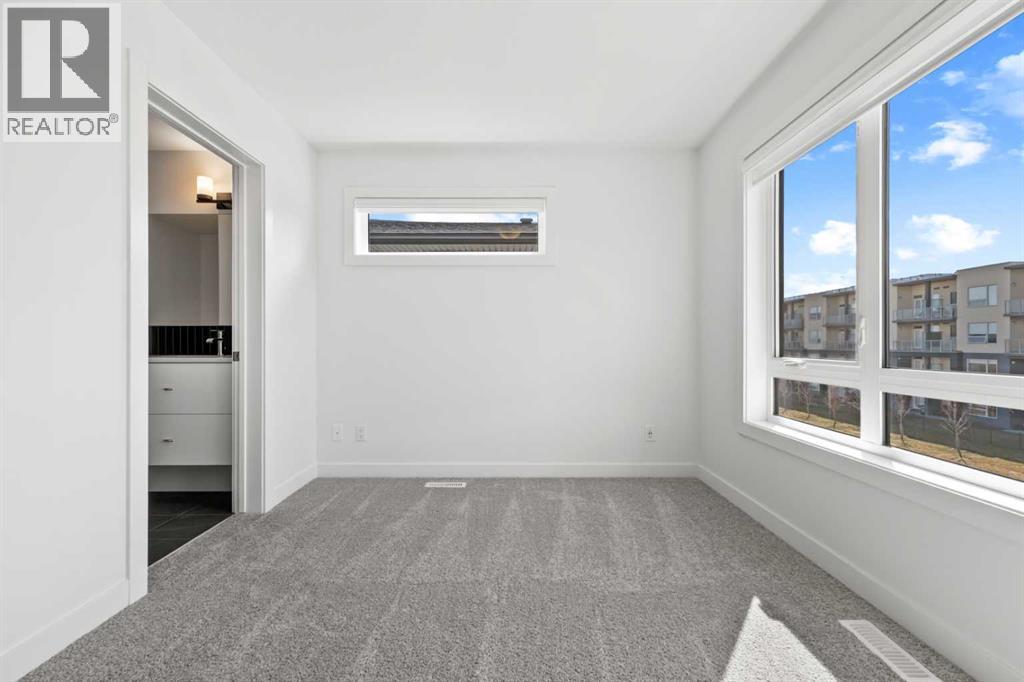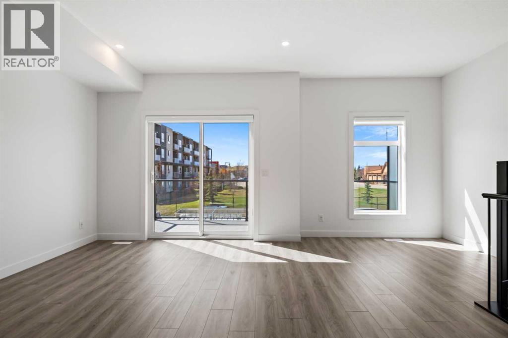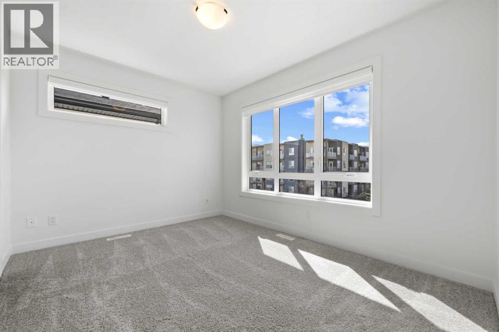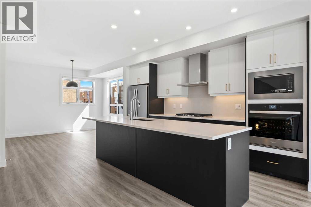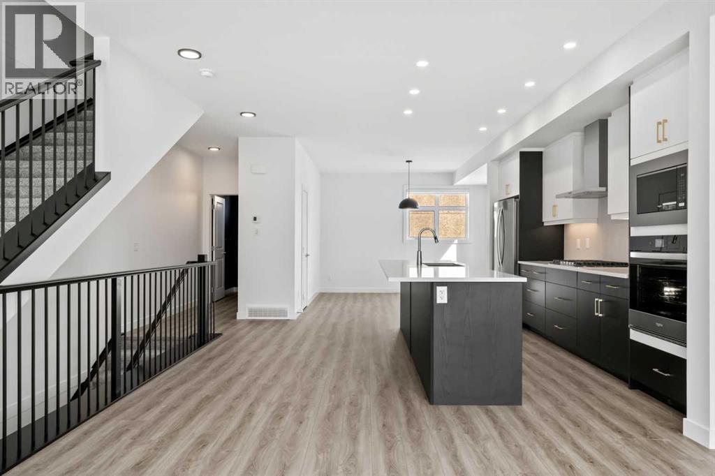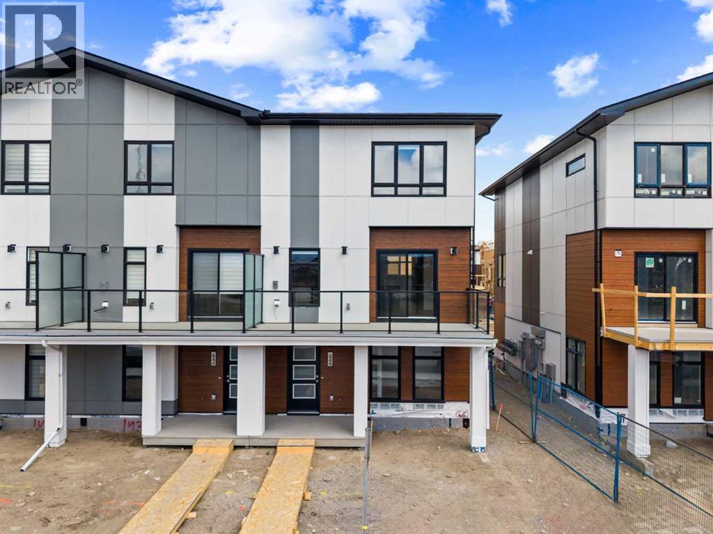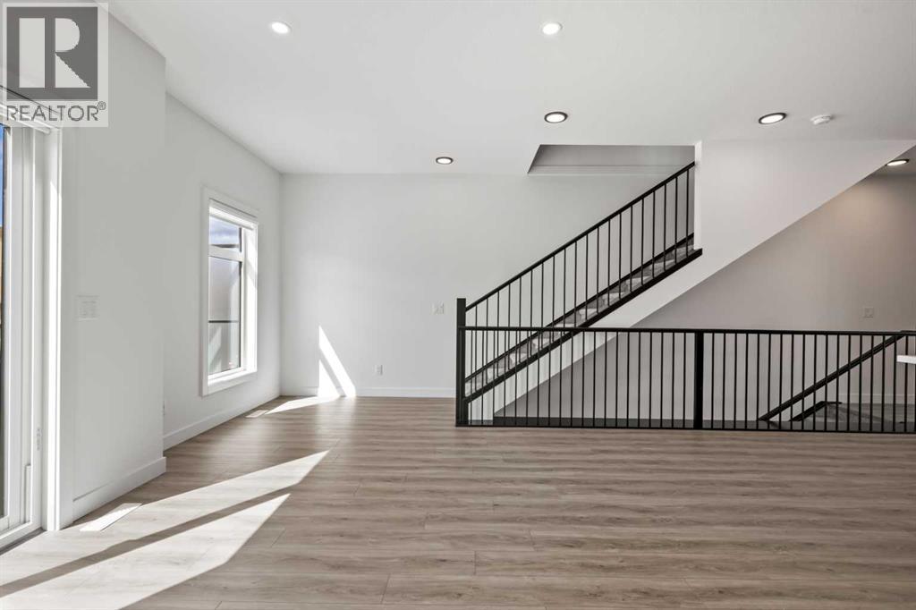 Experience elevated urban living in West Springs with this brand-new, never-occupied three-storey townhouse offering over 2,340 sq. ft. of total living space, sophisticated upgrades, and an unbeatable west Calgary location. Thoughtfully designed with 3 bedrooms, 2.5 bathrooms, a private office/flex space, and a double attached garage, this home blends modern style with everyday functionality.The entry level features a versatile private office/flex room enclosed with elegant double French glass doors, making it ideal for working from home, a fitness space, or additional lounge area. From here, enjoy direct access to the double attached garage and convenient guest street parking on a quiet road.The main living level showcases a bright open-concept layout with oversized windows that flood the home with natural light. Stylish luxury vinyl plank flooring, modern metal railings, upgraded lighting, and a striking dark and moody designer colour palette create a sophisticated atmosphere throughout. The beautifully appointed two-tone kitchen features quartz countertops, a full quartz backsplash, stainless steel appliances, built-in oven, gas cooktop, range hood, and a large island with breakfast bar seating. The spacious dining and living areas flow seamlessly together, creating the perfect space for entertaining or everyday living.Step outside to the impressive oversized west-facing balcony with south exposure, glass railings, unobstructed views, a BBQ gas line, and plenty of room to relax and enjoy sunny afternoons and evening sunsets.Upstairs, the spacious primary retreat offers an extended closet and a private 4-piece ensuite with quartz counters and modern finishes. Two additional bedrooms, another full bathroom, and upper-level laundry complete the top floor, providing convenience for families, professionals, or roommates.Additional highlights include over $22,000 in upgrades, all appliances including washer and dryer, all window coverings, AC rough-in, Hardie board exterior, tankless hot water, and a gradient mechanical system.Located within walking distance to shopping, restaurants, parks, pathways, schools, and everyday amenities, this exceptional West Springs home offers easy access to downtown Calgary, major roadways, and everything west-side living has to offer.Modern design, premium upgrades, and an outstanding location make 848 83 Street SW an incredible opportunity to own in one of Calgary’s most sought-after communities. (id:51913)