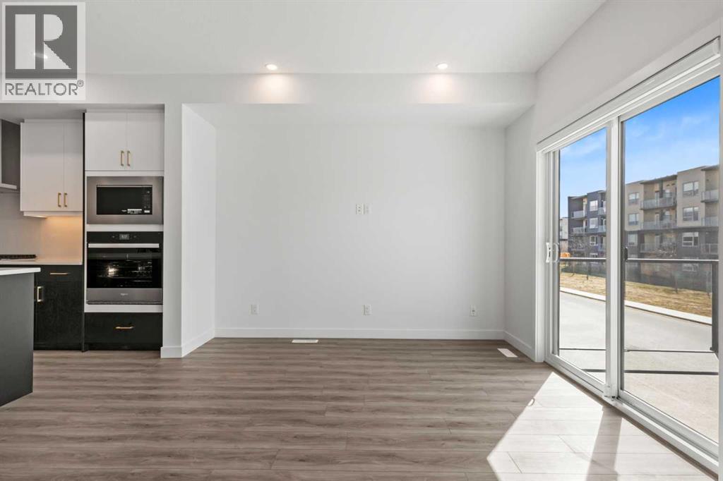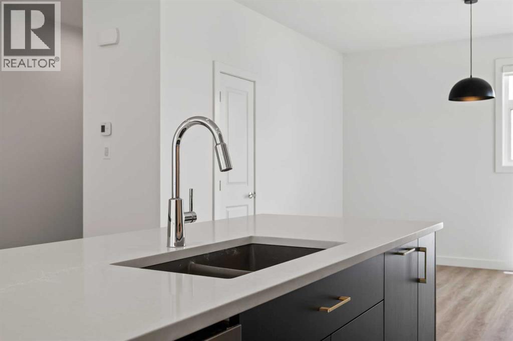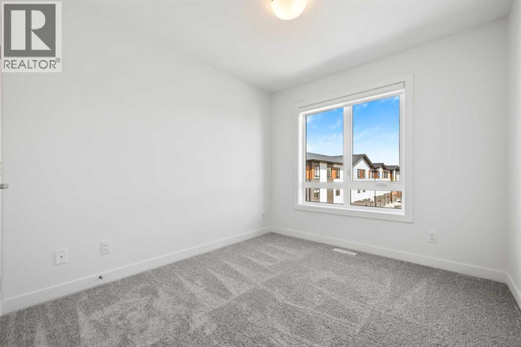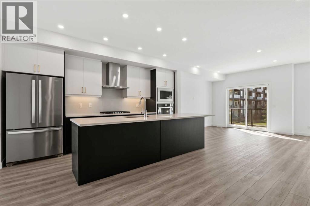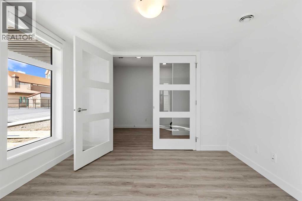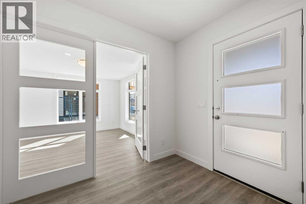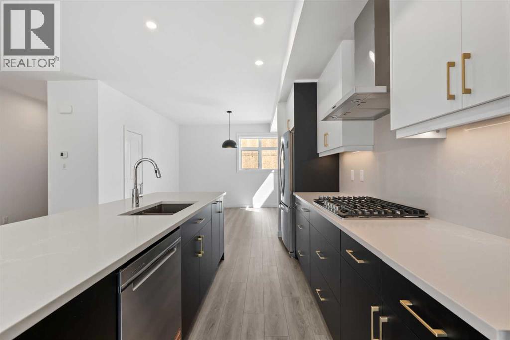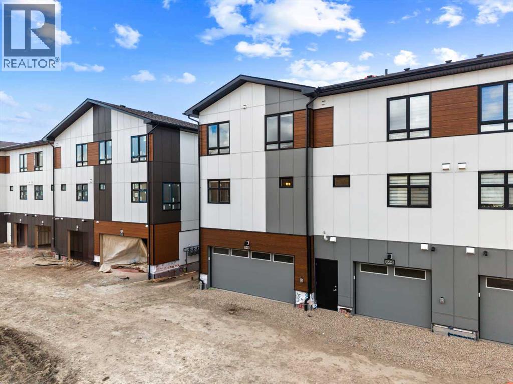 Experience elevated urban living in West Springs with this brand-new, never-occupied three-storey townhouse offering over 2,340 sq. ft. of total living space, sophisticated upgrades, and an unbeatable west Calgary location. Thoughtfully designed with 3 bedrooms, 2.5 bathrooms, a private office/flex space, and a double attached garage, this home blends modern style with everyday functionality.The entry level features a versatile private office/flex room enclosed with elegant double French glass doors, making it ideal for working from home, a fitness space, or additional lounge area. From here, enjoy direct access to the double attached garage and convenient guest street parking on a quiet road.The main living level showcases a bright open-concept layout with oversized windows that flood the home with natural light. Stylish luxury vinyl plank flooring, modern metal railings, upgraded lighting, and a striking dark and moody designer colour palette create a sophisticated atmosphere throughout. The beautifully appointed two-tone kitchen features quartz countertops, a full quartz backsplash, stainless steel appliances, built-in oven, gas cooktop, range hood, and a large island with breakfast bar seating. The spacious dining and living areas flow seamlessly together, creating the perfect space for entertaining or everyday living.Step outside to the impressive oversized west-facing balcony with south exposure, glass railings, unobstructed views, a BBQ gas line, and plenty of room to relax and enjoy sunny afternoons and evening sunsets.Upstairs, the spacious primary retreat offers an extended closet and a private 4-piece ensuite with quartz counters and modern finishes. Two additional bedrooms, another full bathroom, and upper-level laundry complete the top floor, providing convenience for families, professionals, or roommates.Additional highlights include over $22,000 in upgrades, all appliances including washer and dryer, all window coverings, AC rough-in, Hardie board exterior, tankless hot water, and a gradient mechanical system.Located within walking distance to shopping, restaurants, parks, pathways, schools, and everyday amenities, this exceptional West Springs home offers easy access to downtown Calgary, major roadways, and everything west-side living has to offer.Modern design, premium upgrades, and an outstanding location make 848 83 Street SW an incredible opportunity to own in one of Calgary’s most sought-after communities. (id:51913)