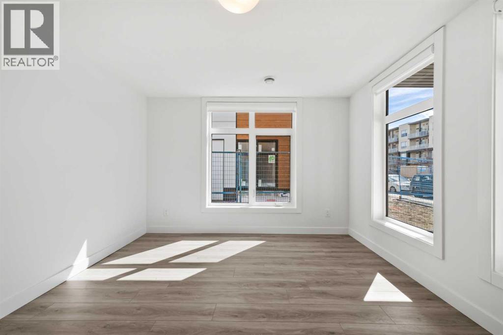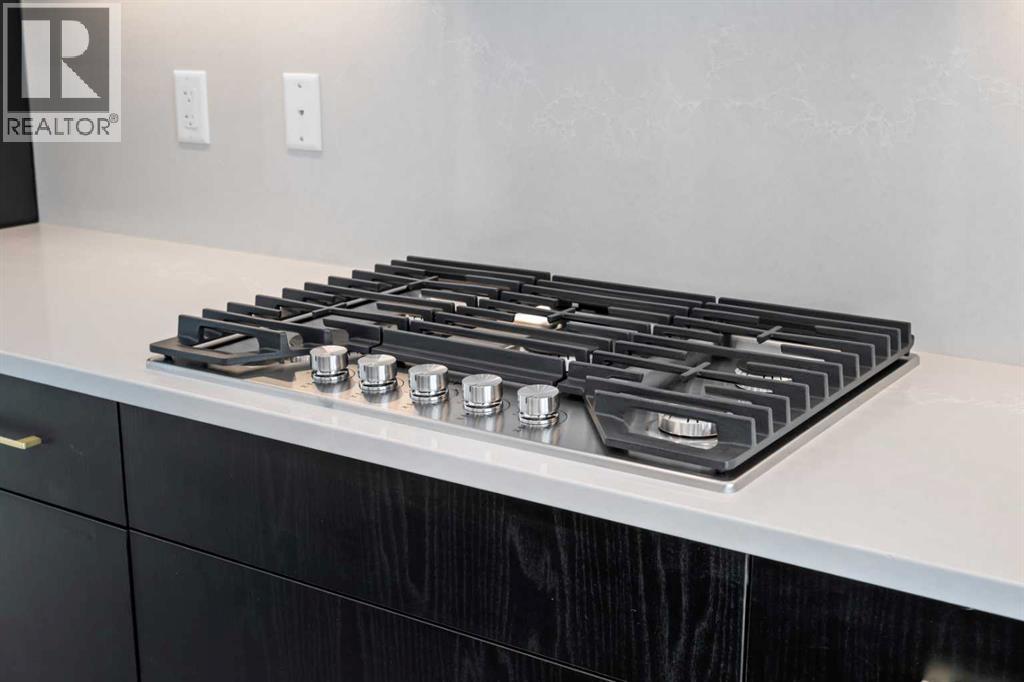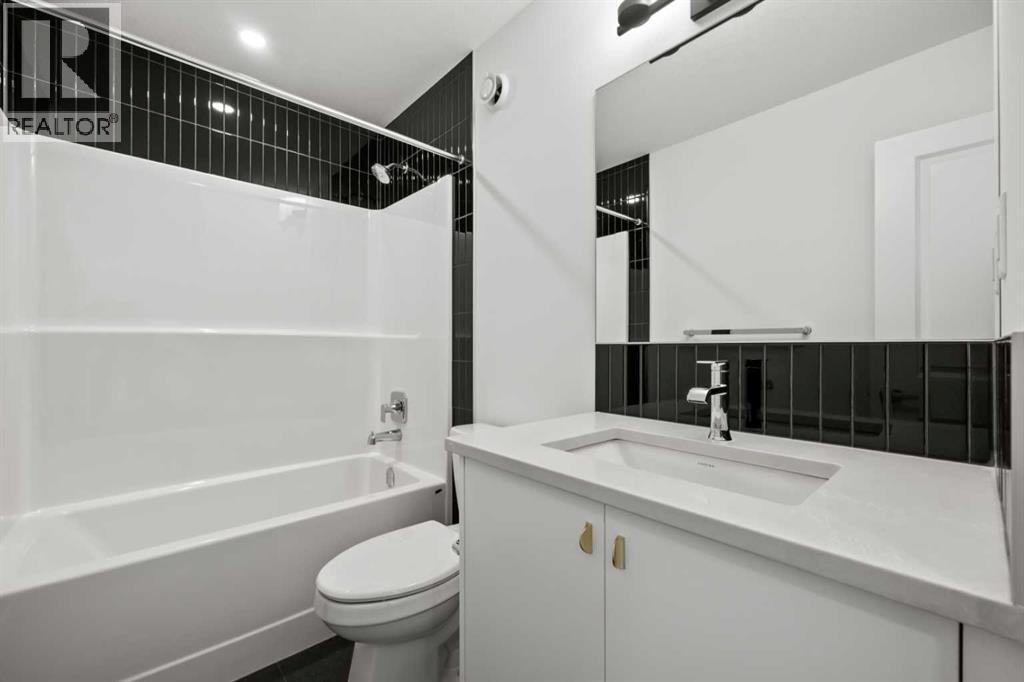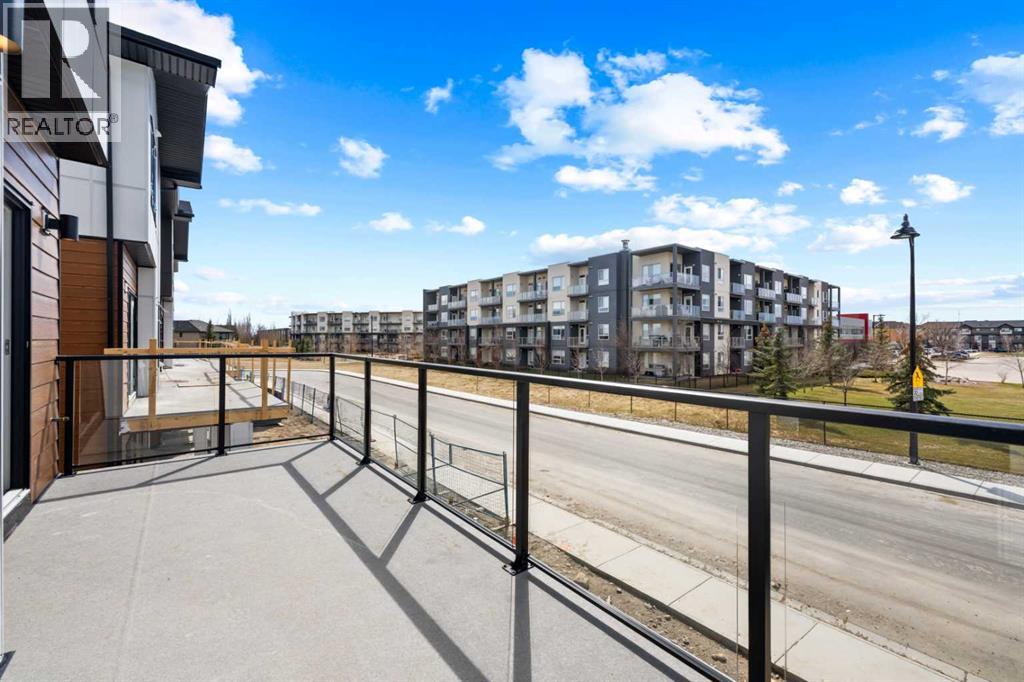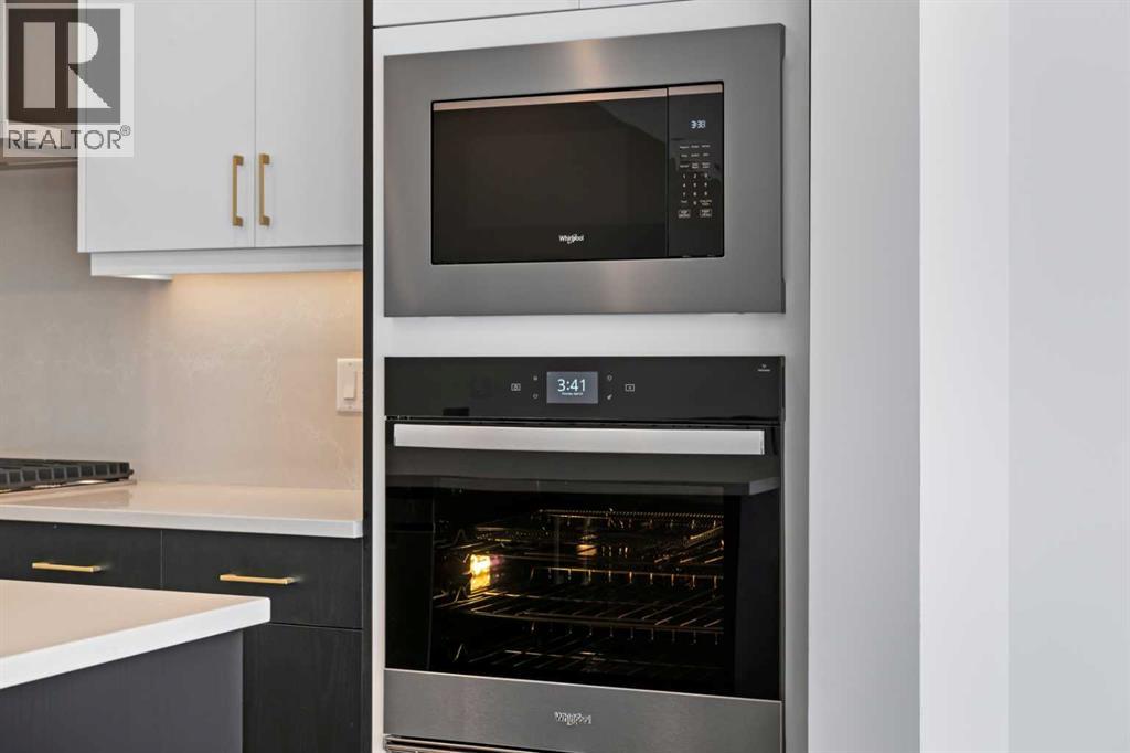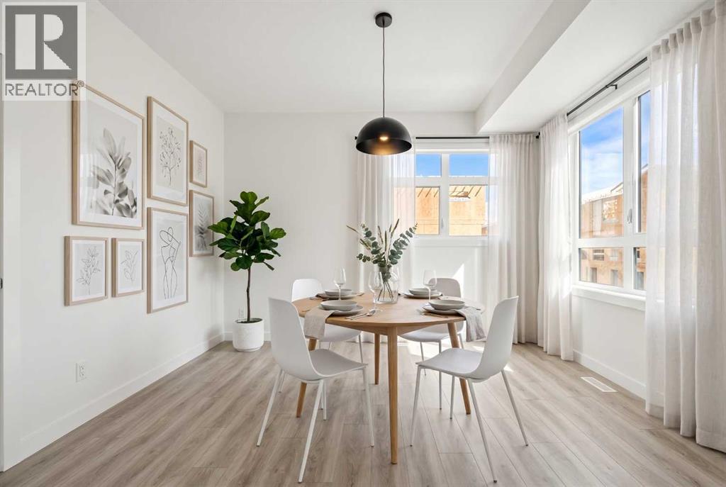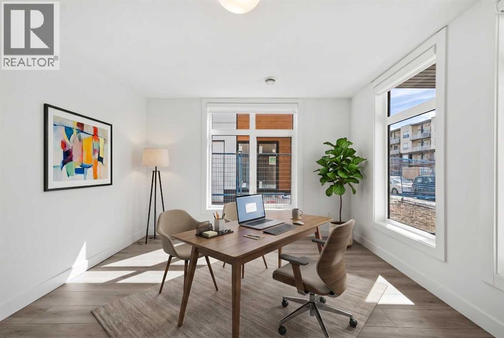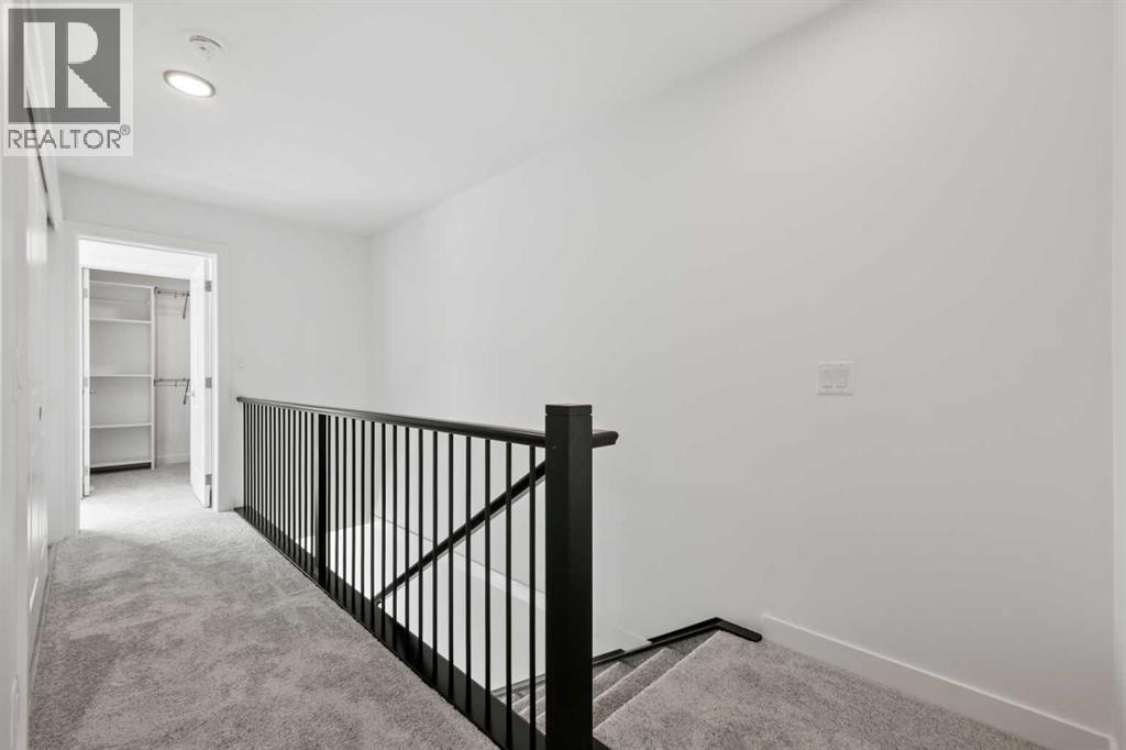 Experience elevated urban living in West Springs with this brand-new, never-occupied three-storey townhouse offering over 2,340 sq. ft. of total living space, sophisticated upgrades, and an unbeatable west Calgary location. Thoughtfully designed with 3 bedrooms, 2.5 bathrooms, a private office/flex space, and a double attached garage, this home blends modern style with everyday functionality.The entry level features a versatile private office/flex room enclosed with elegant double French glass doors, making it ideal for working from home, a fitness space, or additional lounge area. From here, enjoy direct access to the double attached garage and convenient guest street parking on a quiet road.The main living level showcases a bright open-concept layout with oversized windows that flood the home with natural light. Stylish luxury vinyl plank flooring, modern metal railings, upgraded lighting, and a striking dark and moody designer colour palette create a sophisticated atmosphere throughout. The beautifully appointed two-tone kitchen features quartz countertops, a full quartz backsplash, stainless steel appliances, built-in oven, gas cooktop, range hood, and a large island with breakfast bar seating. The spacious dining and living areas flow seamlessly together, creating the perfect space for entertaining or everyday living.Step outside to the impressive oversized west-facing balcony with south exposure, glass railings, unobstructed views, a BBQ gas line, and plenty of room to relax and enjoy sunny afternoons and evening sunsets.Upstairs, the spacious primary retreat offers an extended closet and a private 4-piece ensuite with quartz counters and modern finishes. Two additional bedrooms, another full bathroom, and upper-level laundry complete the top floor, providing convenience for families, professionals, or roommates.Additional highlights include over $22,000 in upgrades, all appliances including washer and dryer, all window coverings, AC rough-in, Hardie board exterior, tankless hot water, and a gradient mechanical system.Located within walking distance to shopping, restaurants, parks, pathways, schools, and everyday amenities, this exceptional West Springs home offers easy access to downtown Calgary, major roadways, and everything west-side living has to offer.Modern design, premium upgrades, and an outstanding location make 848 83 Street SW an incredible opportunity to own in one of Calgary’s most sought-after communities. (id:51913)
